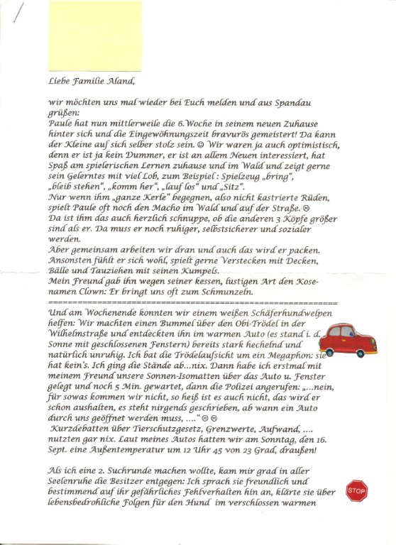 003Paulchen hat ein Frauchen gefunden, dass sehr gut auf ihn aufpasst. Und nicht nur auf ihn. Als sein Frauchen einen weißen Schäferhundwelpen in Not entdeckte, ließ sie nicht locker, bis die Situation geklärt war.