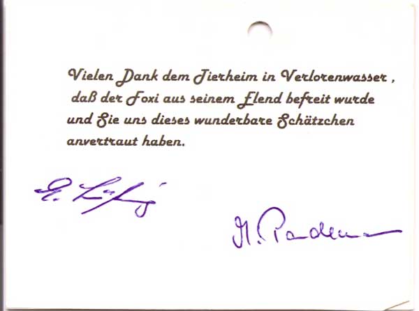 So ich hoffe Ihr seid nicht traurig, wenn ich nicht mehr zu Euch ins Tierheim zurückkommen möchte. Aber Ihr habt ja noch genügend andere Tiere da, um die Ihr Euch kümmern müßt. Vielleicht kommen wir Euch mal besuchen.