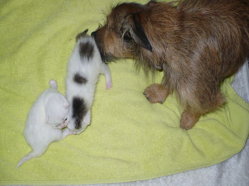 Ich sage Euch, das letzte Jahr war hier vielleicht aufregend und anstrengend. Das muss ich Euch erzählen. Wir haben hier doch 4 Katzenbabys von 2 Mamas bekommen. Das war ein Ding. Aber unsere eine Mami, die Miss Elly, konnte sich die ersten Tage nicht um ihre 2 Babys kümmern. Sie hat sehr hohes Fieber bekommen und konnte ihre Babys weder säugen noch pflegen. Und nun komme ich ins Spiel. Mein von mir heißgeliebtes Frauchen und unsere Tierärztin haben voller Stolz gesagt, wenn ich nicht gewesen wäre, wären diese Babys nicht mehr am Leben. Mein Frauchen und Alexandra haben beiden rund um die Uhr das Fläschchen gegeben, und ich habe den Putz und Pflegedienst übernommen. Ich durfte sogar mit in der Wurfkiste liegen, soviel Vertrauen hatte Miss Elly. Dies war alles furchtbar aufregend und anstrengend, aber diese ganze Mühe hat sich gelohnt. Aus 182 gr Katzenbaby ist nun eine 2,8 kg schwere Katze geworden, und das schmusen und gegenseitige putzen ist geblieben. Aber dann kam das aller schlimmste, und das hieß Abschied nehmen. Leute, das sind doch "meine" Babys und die sind nun bei neuen Familien. Das gute an der Sache ist aber, das diese Familien uns schreiben und mir Bilder schicken, damit ich immer weiß, wie es meinen Babys geht.