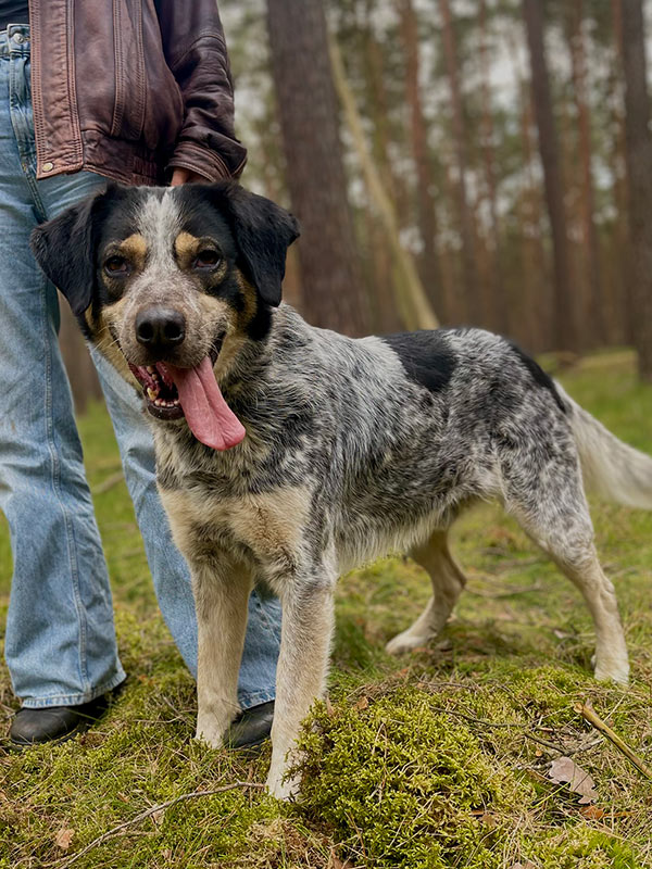 Neuen Menschen gegenüber ist er etwas misstrauisch und wartet ab. Sie dürfen ihn auch nicht über den Kopf streicheln. Das verbietet sich aber grundsätzlich bei jedem fremden Hund, denn so eine Distanzunterschreitung ist zunächst eine Bedrohung für jeden Hund.