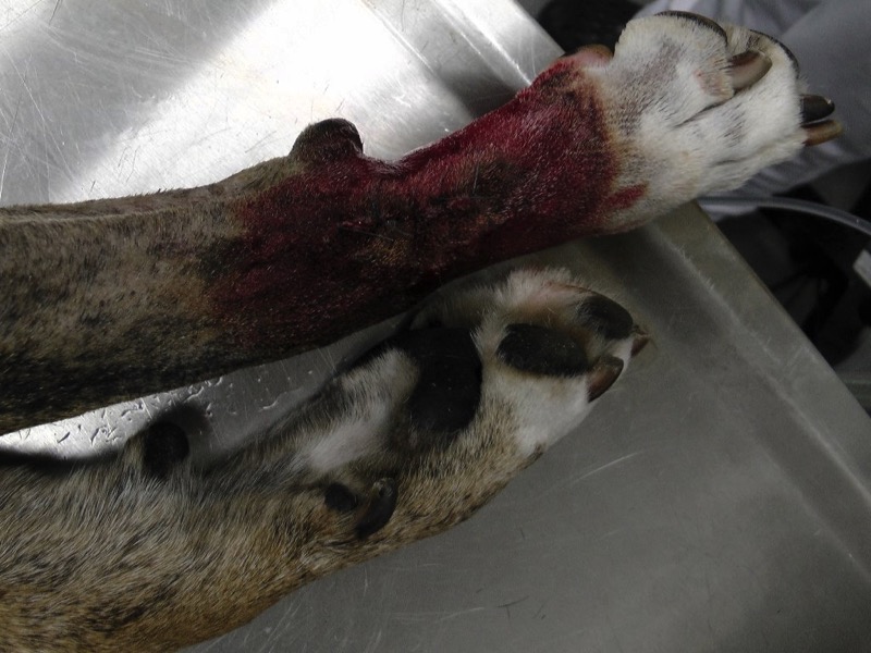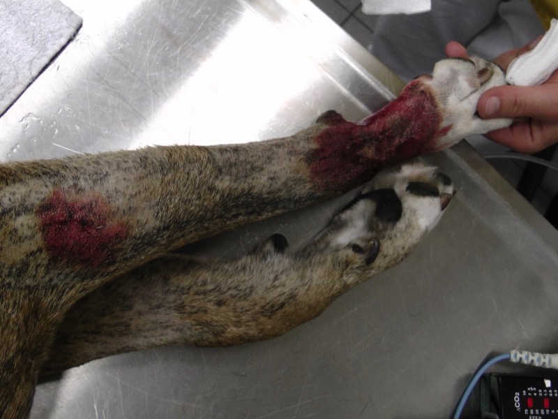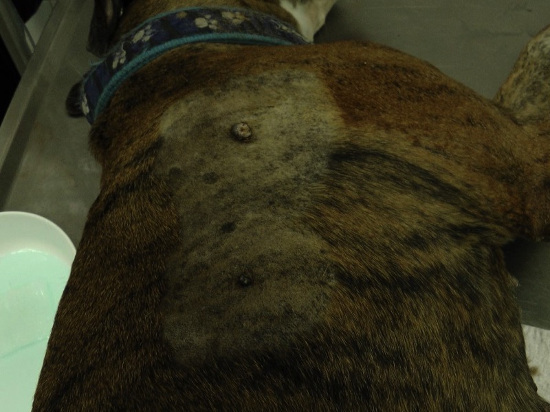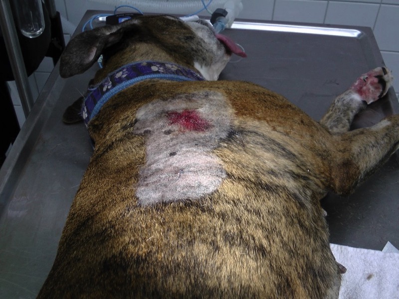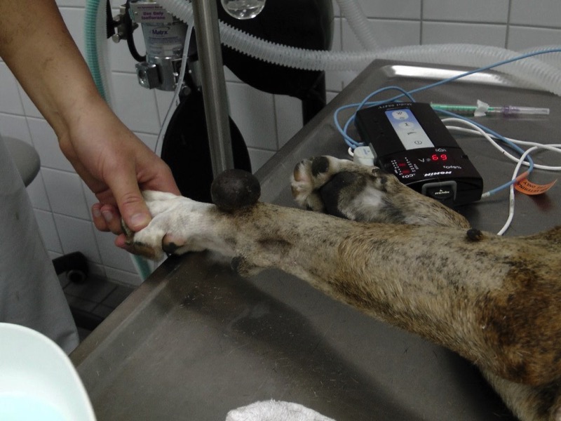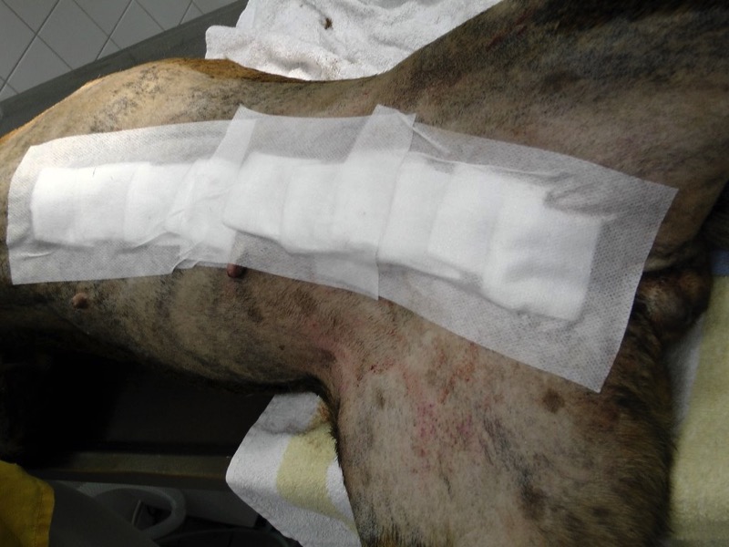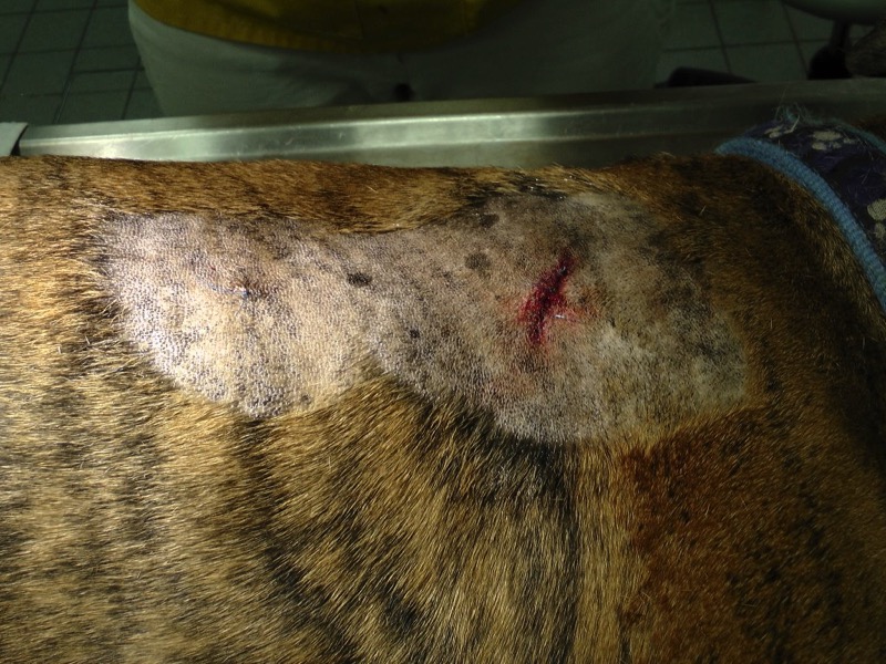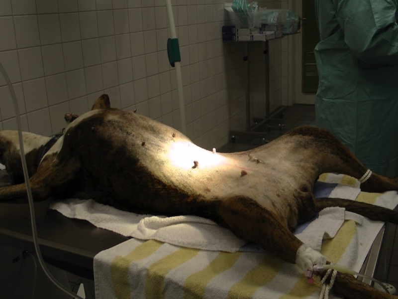 Wegen Wucherungen musste eine Milchleiste entfernt werden. Auf dem Rücken und am Bein gab es weitere Wucherungen und Warzen. Wir lassen ältere Hunde ungern operieren, aber bei Lisa musste es einfach sein, bevor die bisher gutartigen Gewächse sich verändern oder zu groß werden und dann ernsthafte Probleme verursachen. Der große "Ball" am Fuß waren wahrscheinlich entartete Haarwurzeln.