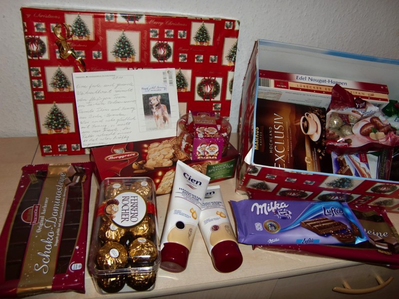 Da tropfte nicht nur unseren Vierbeinern der Zahn nach dem feinen "Fresschen" - auch für die Mitarbeiter gab es einen schweren Karton Delikatessen. Von schöner Handcreme über allerlei Schokoladen- und Weihnachtsspezialitäten ist für jeden etwas dabei. So schmeckt der Feierabend dann doppelt süß.