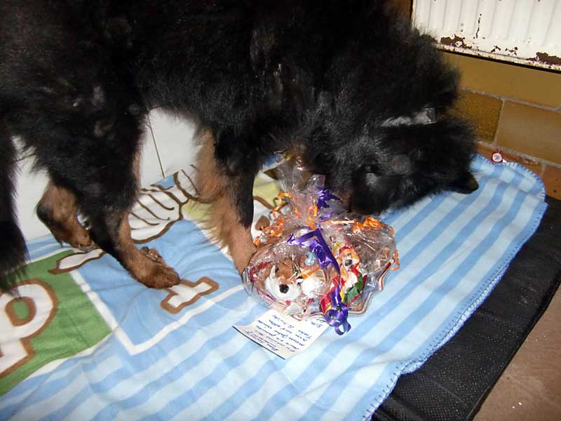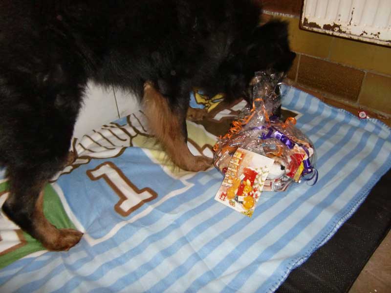 Eine Berliner Familie sandte ein Paket für Harvey. Eine ganz weiche Decke und ein liebevoll zusammengestelltes Fress- und Spielzeugpaket fanden großes Interesse bei Harvey und er machte sich sofort fachmännisch ans Auspacken.