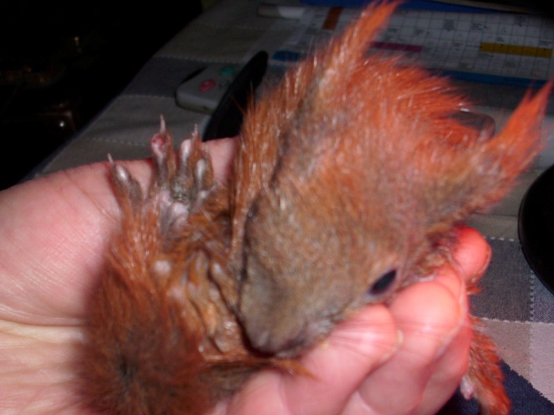 Am Sonntag stand ein Berliner Ehepaar mit einem kleinen Eichhörnchen bei uns vor der Tür. Es hatte in Britz an der Stoßstange eines Autos geklebt. Eine ehrenamtliche Helferin nahm das Kleine sofort bei sich zu Hause auf. Es war völlig unterkühlt, schlimm ausgehungert, ausgetrocknet und hatte Parasiten.