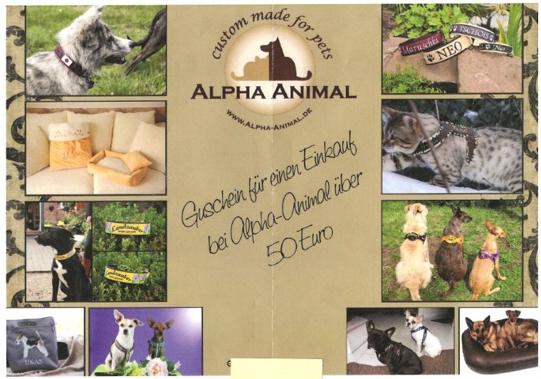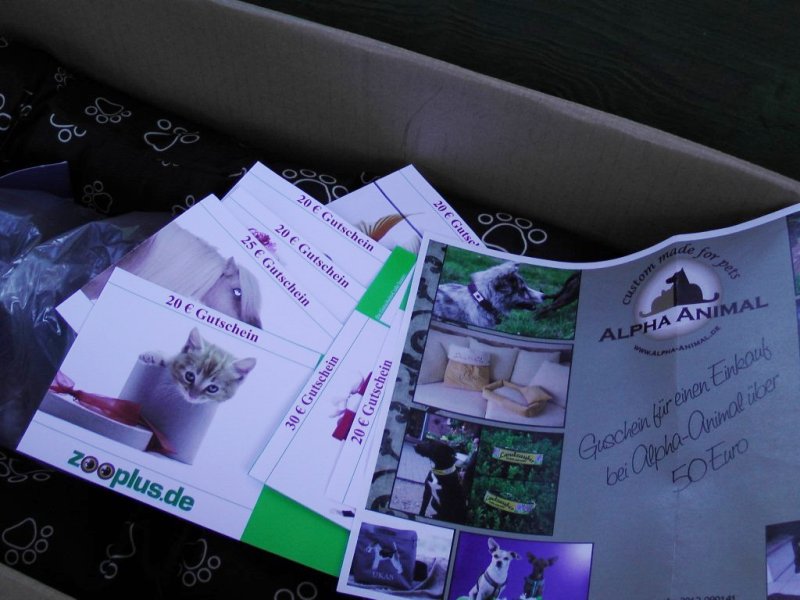 Als Frau H. jetzt die Arbeitsstelle wechselte, schenkten ihr die Kollegen einen ganz besonderen Präsentkorb zum Abschied. Der Inhalt ließ uns wieder einmal staunen: Feinstes Fresschen, etliches zum Wohlfühlen und außerdem noch eine ganze Reihe von Gutscheinen im Wert von über 200 Euro für unsere Tiere.