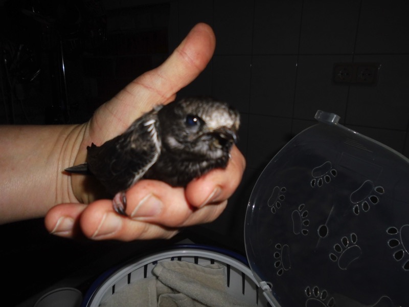 Der kleine Mauersegler war aus dem Nest gefallen und saß hilflos auf dem Boden, wo ein engagierter Tierfreund ihn fand. Im Gegensatz zu anderen Wildvögeln werden junge Mauersegler außerhalb des Nestes nicht von den Elterntieren weitergefüttert. Sie sind dem Hungertod preisgegeben, wenn ihnen der Mensch nicht hilft.
