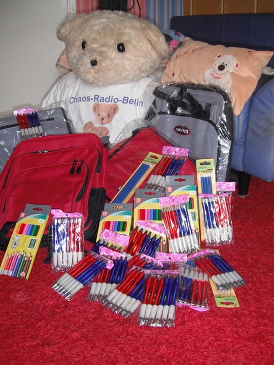 Bitte haben Sie Verständnis, dass wir nur einige Beispiele fotografieren konnten. Wir danken allen Spendern sehr herzlich für die tollen Ranzen und die schönen Beigaben! Stellvertretend für alle gilt unser Dank Familie Basti, Familie Maira, den Machern und Hörern vom Chaos-Radio-Berlin, Janine, Julchen, ...