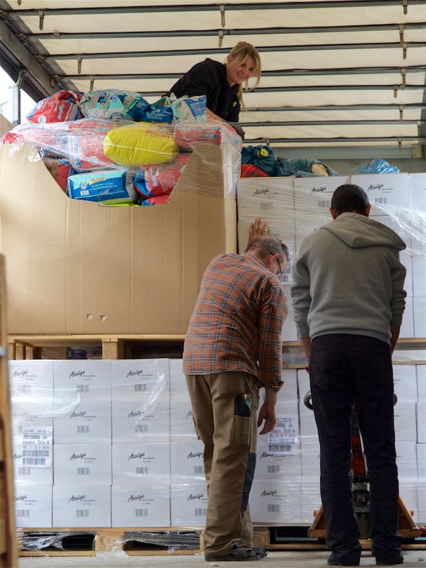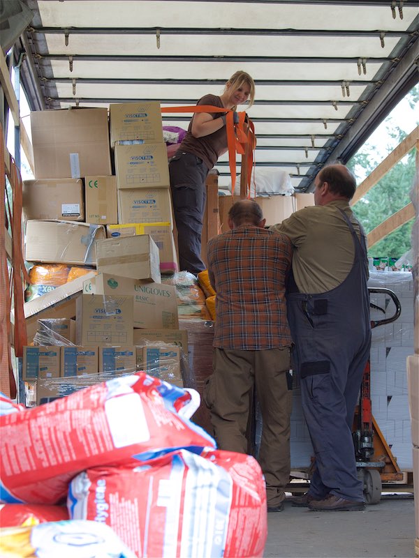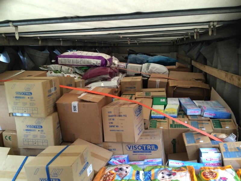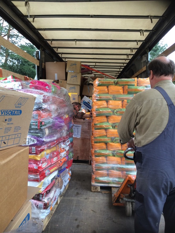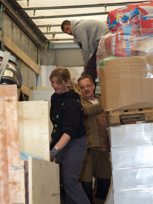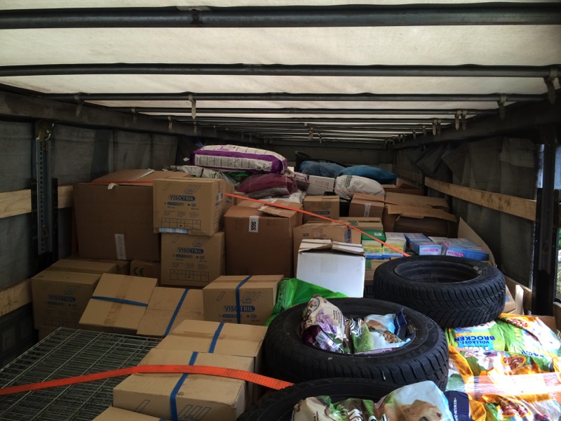 Heute war es nun so weit: Futter und Leckerli, Tierarztmaterial, Decken, Körbchen, Werkzeuge, Gefrierschränke und etliches mehr konnten unsere fleißigen Ehrenamtler verladen. Unterstützt wurden sie von zwei Tierheimmitarbeitern, die heute eigentlich ihren freien Tag gehabt hätten.