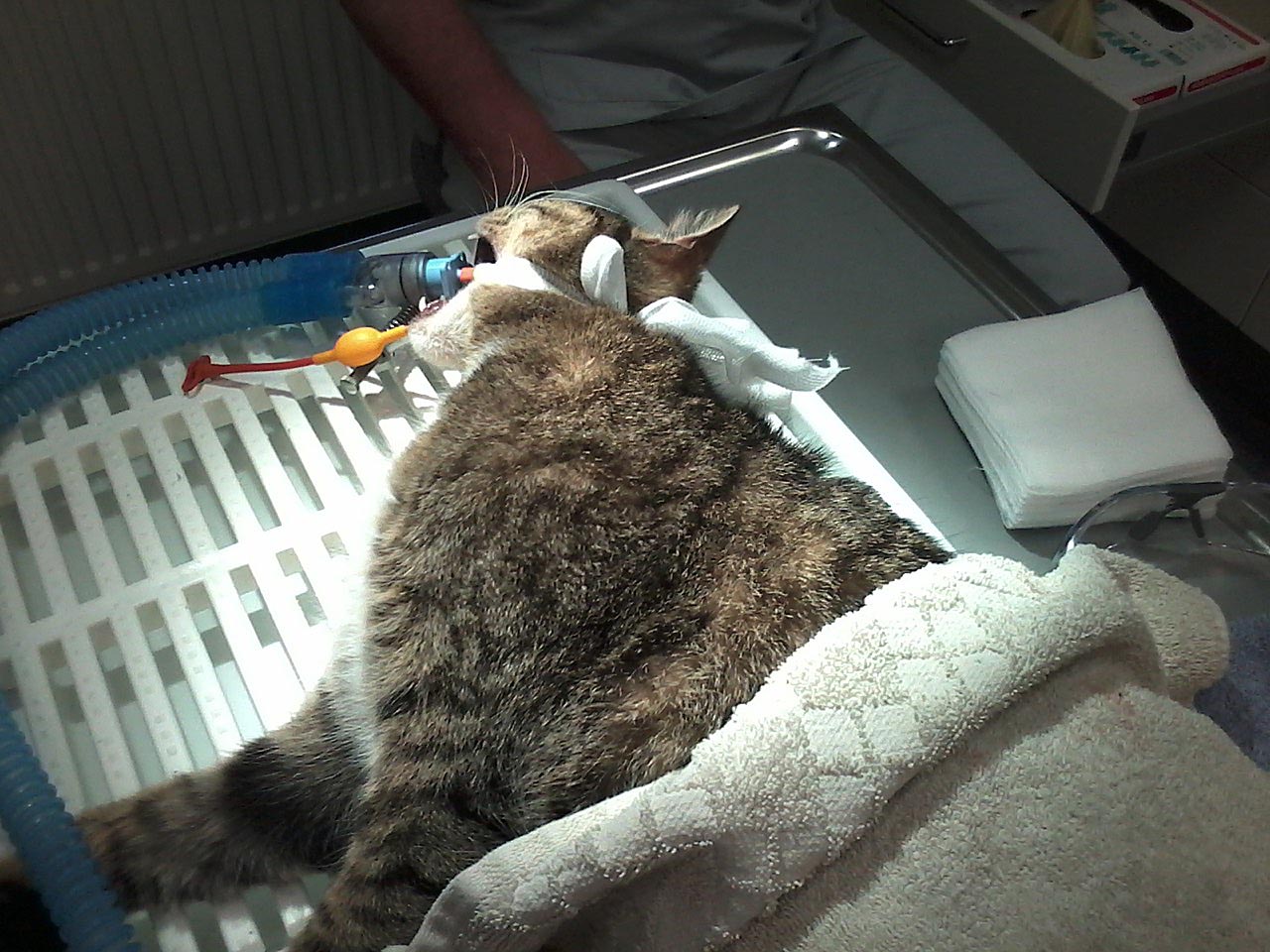 Übrigens noch zur Erklärung: Eine Zahn-OP kann recht lange dauern. Bei Katzen kann man Zähne nicht einfach so ziehen wie bei Menschen, sondern muss im Prinzip eine Kiefer-OP durchführen. Unter normaler Narkose sinkt die Sauerstoffversorgung des Gehirns bei längeren Eingriffen teilweise dramatisch und kann zu bleibenden Schäden im Gehirn führen. Deshalb ist es so wichtig, einen Tierarzt zu finden, der über die nötige Ausstattung verfügt.