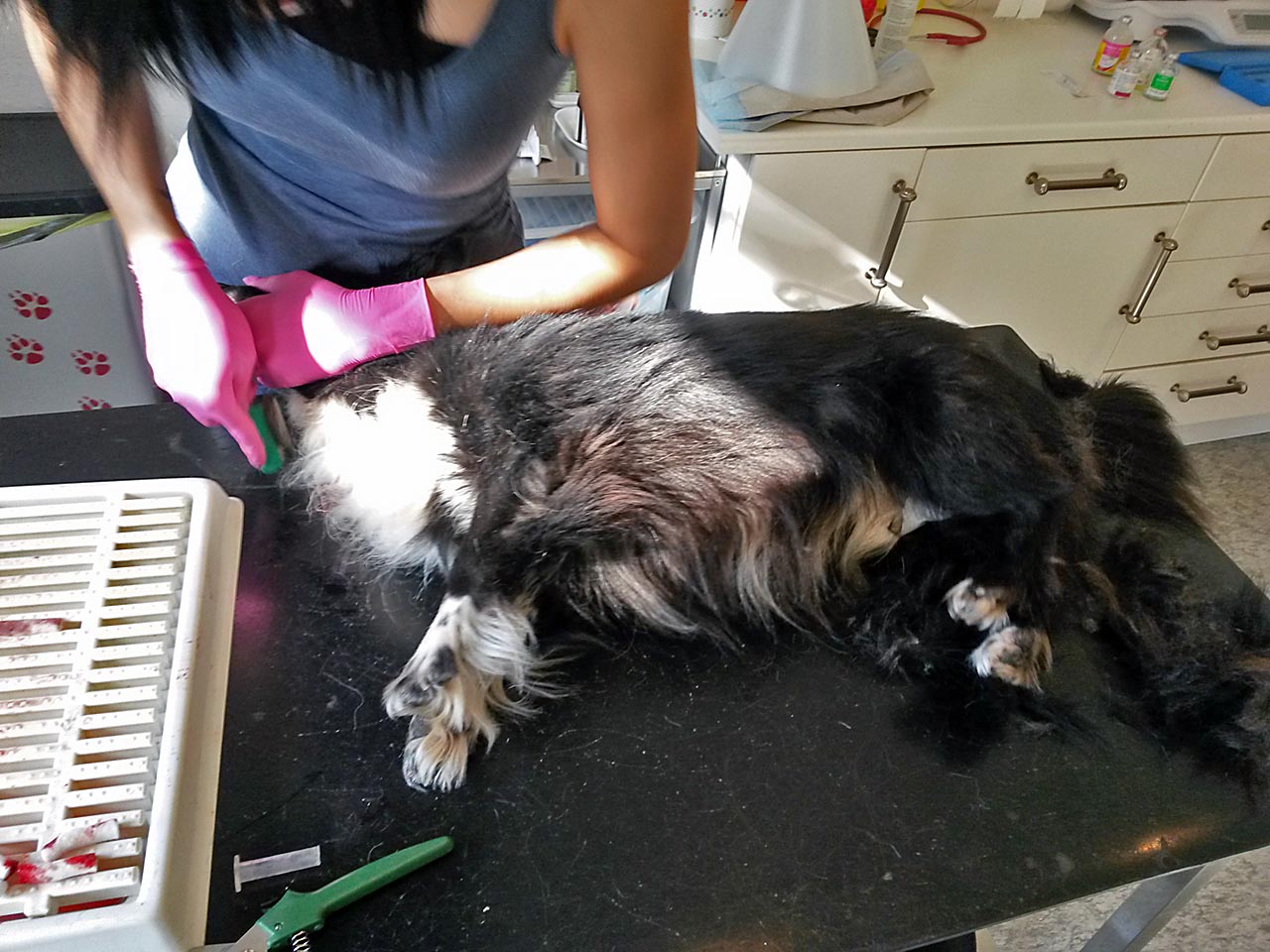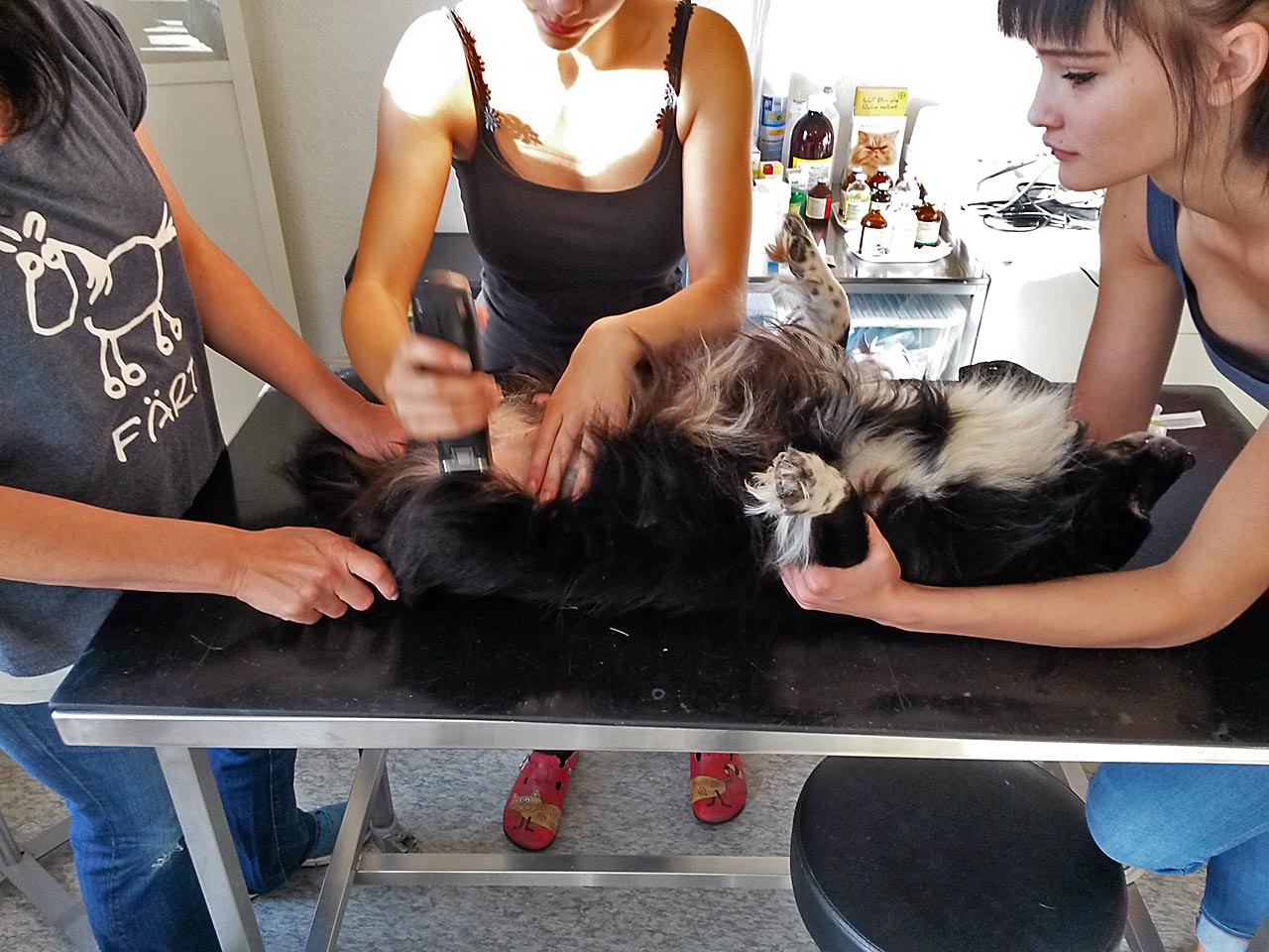 Natürlich wurden gleich noch Wolfskrallen geschnitten und Tiere mit stark verfilztem Fell, an die wir sonst nicht herankommen, geschoren.