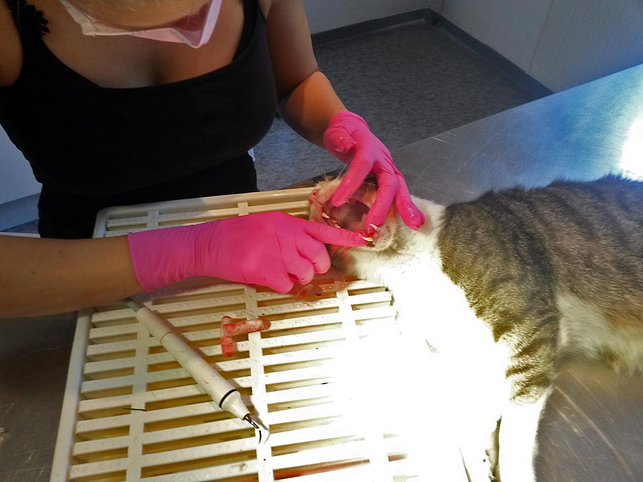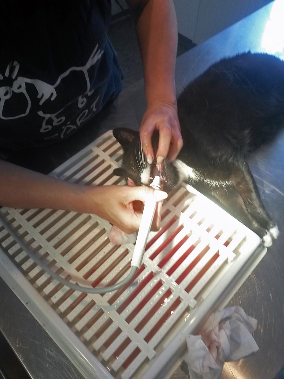 Die Katzen, die nicht kastriert waren, wurden gleich mit operiert. So mussten sie nicht zweimal in Narkose. Bei Tobias laserte Frau Dr. Höfer einen Tumor. Leider stellte sich heraus, dass nicht nur das Zahnfleisch, sondern auch der Knochen betroffen ist. Wir müssen nun schauen, wie der Tumor sich weiter entwickelt.