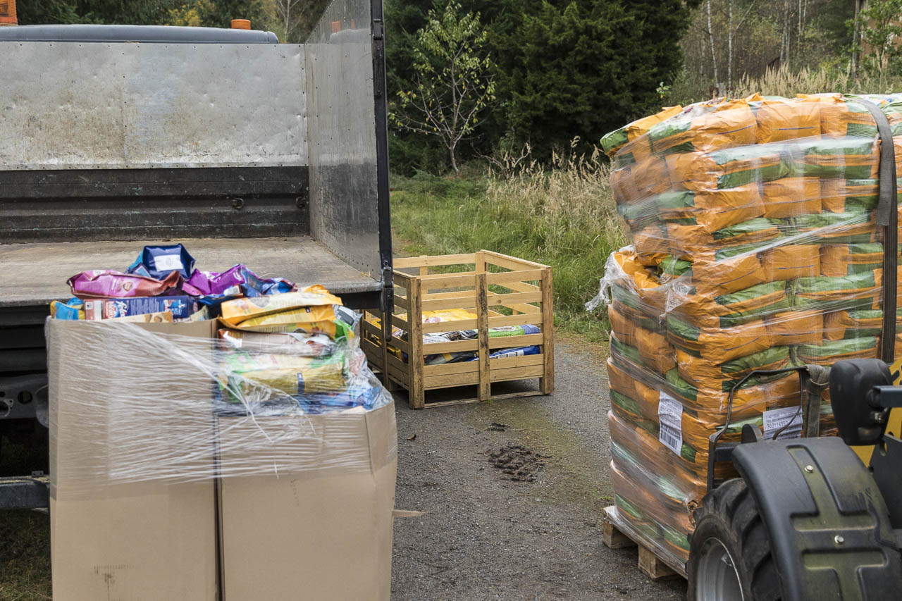 Natürlich haben wir weiter Futter gesammelt, um etwas zur Versorgung "unserer" Katzen und der anderen dort lebenden Tiere beizutragen. Vorige Woche war wieder eine Ladung beisammen. Als der Transporter am Samstag eintraf, konnten wir ihn aber nicht beladen, sondern mussten zuerst abladen. Unsere Tierfreunde hatten uns zwei große wunderbar duftende Heuballen mitgebracht und noch Gerste und Weizen für unsere Nutztiere obendrein spendiert.