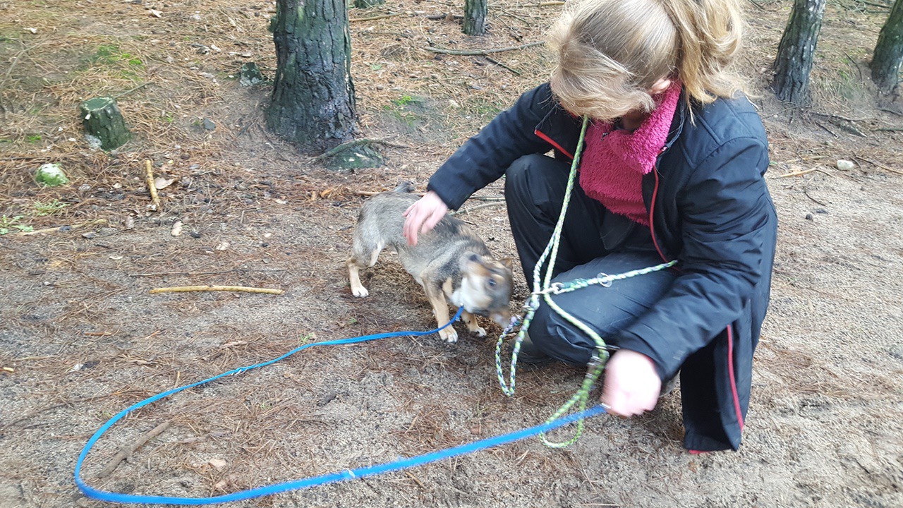 Bei unserem Ehrenamtler Clemens auf dem Arm sitzt eine helle beigefarbene Hündin. Der schwarze Welpe mit der weißen Brust ist ein Rüde. Die Strubbeline mit hellen Haaren um die Nase herum ist ein Welpenmädchen.