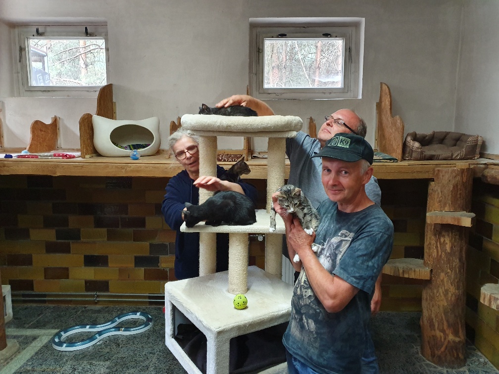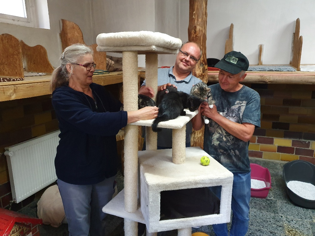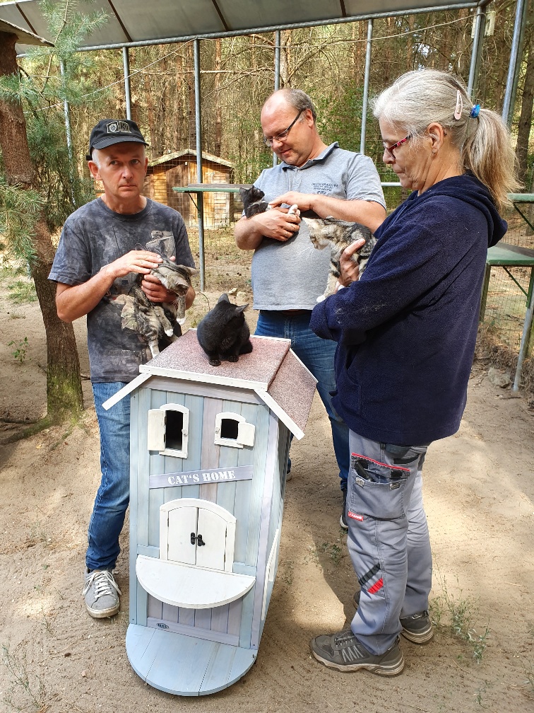 Tierheimleiter Maciej (mit Basecap), Dolmetscher Michael und unsere Tierpflegerin Ilona weihten dann auch gleich ein Katzen-Häuschen ein, dass wir just von einem Fressnapf in Berlin gespendet bekommen hatten.
