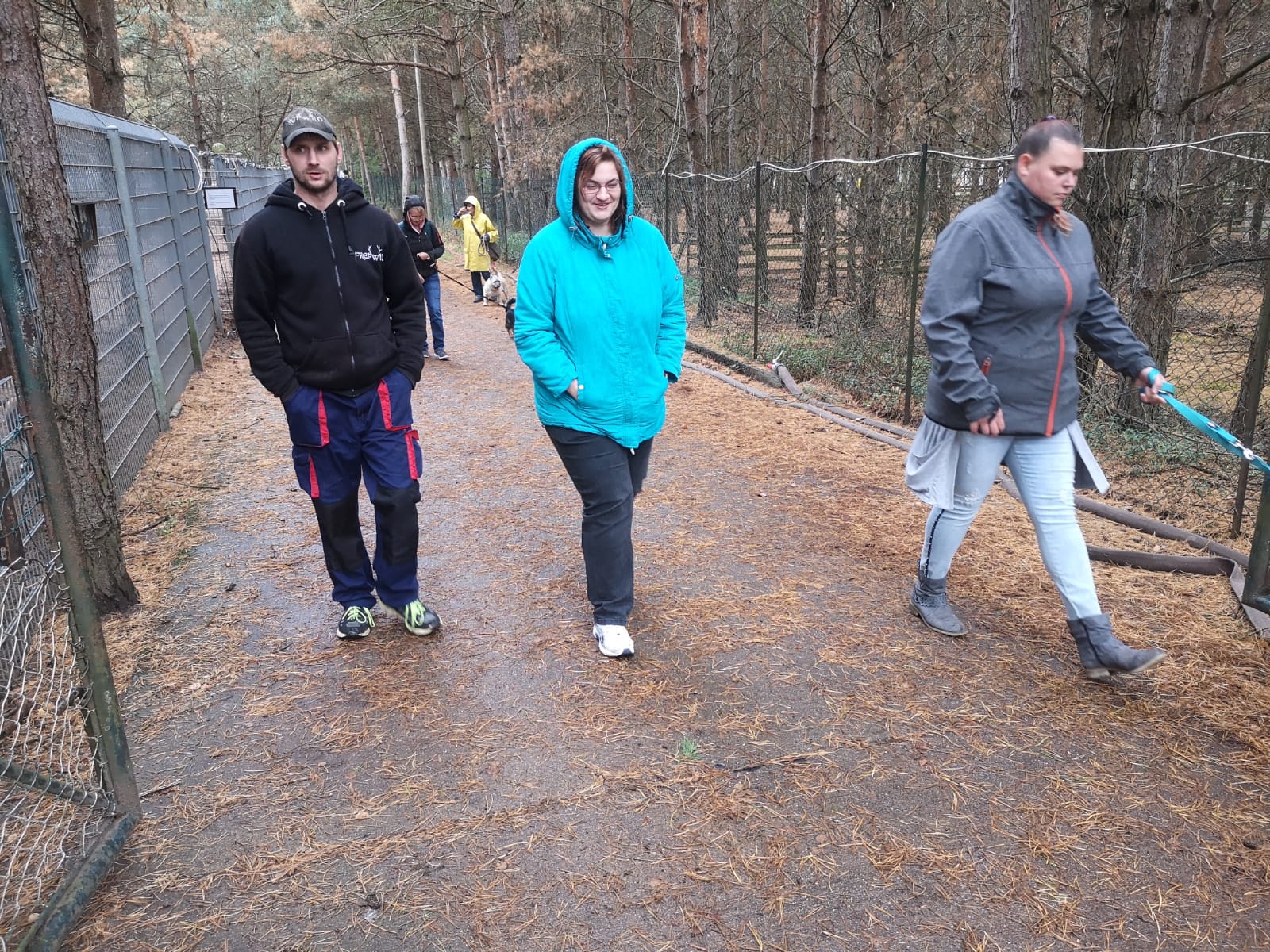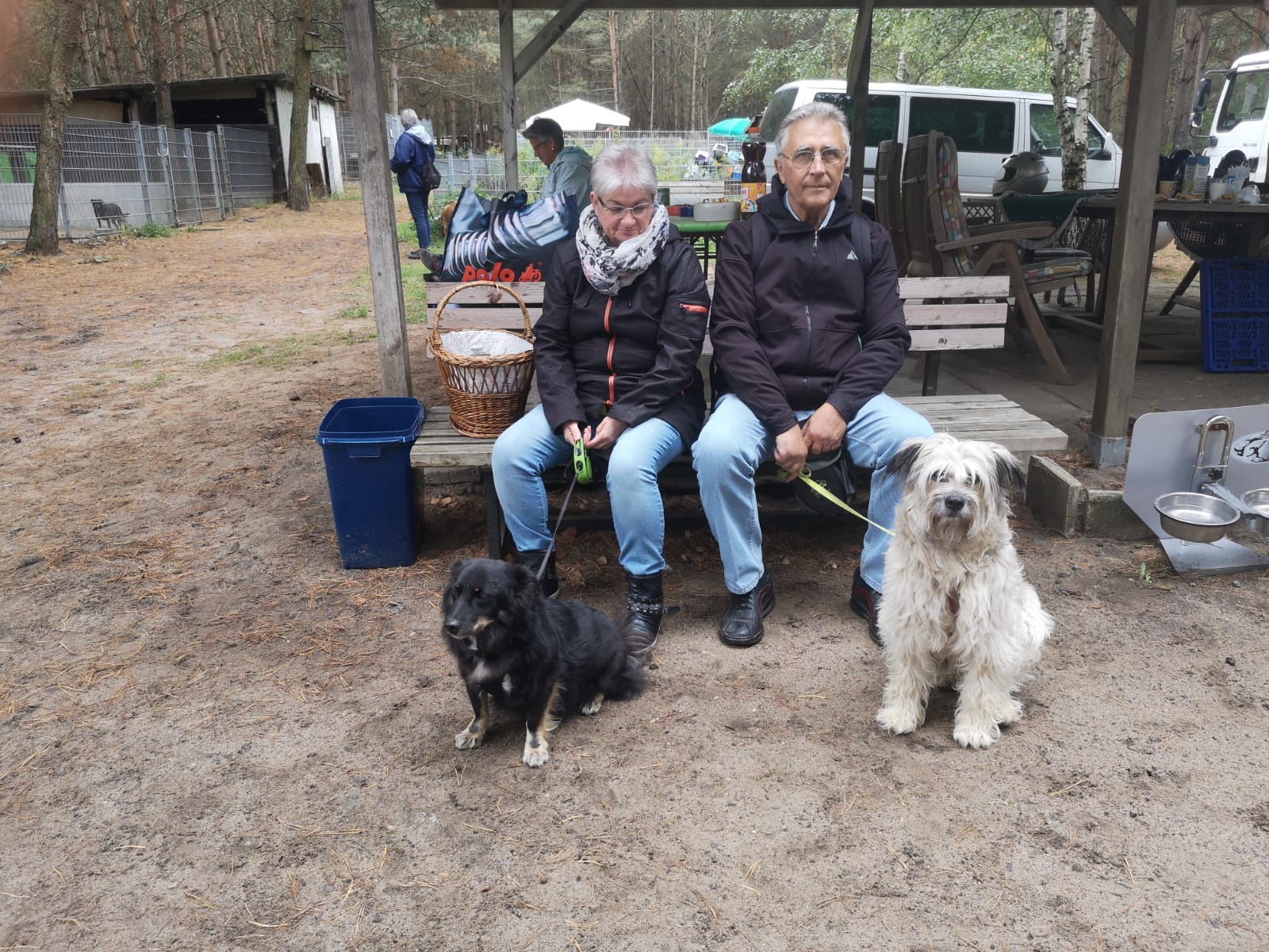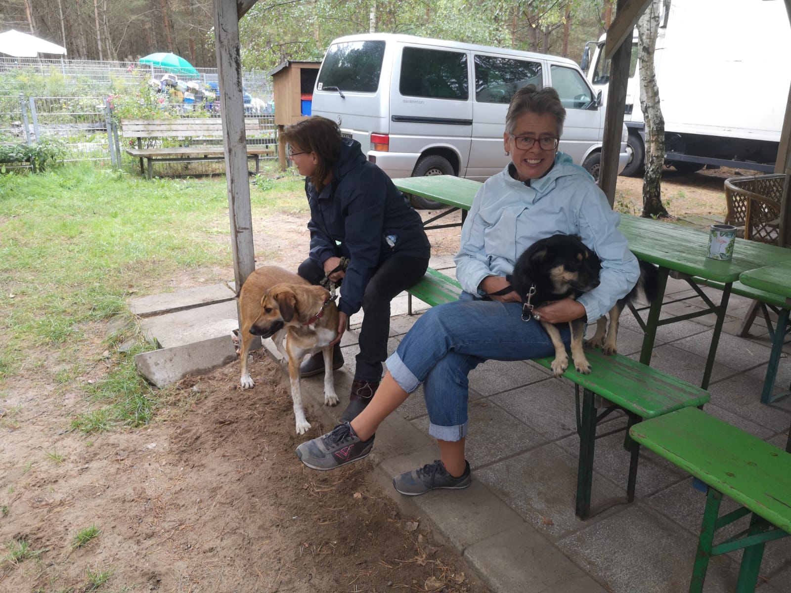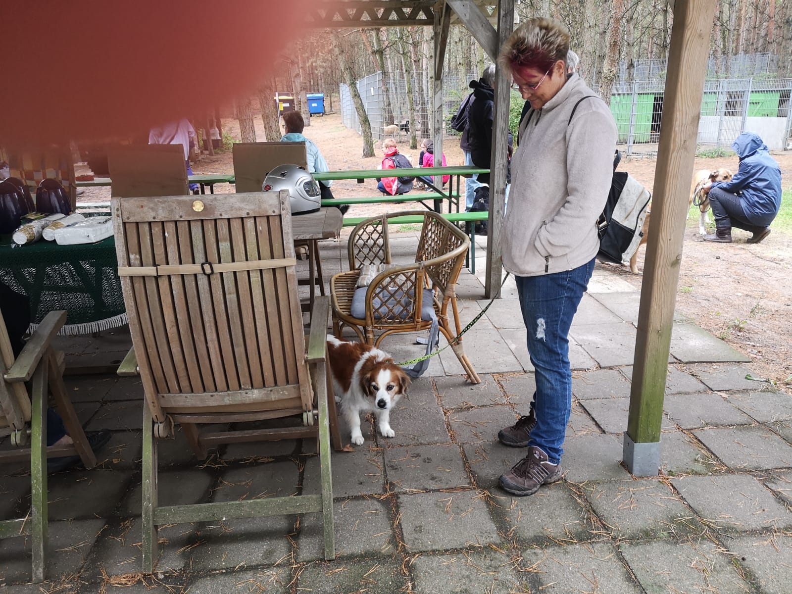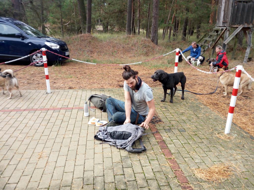 12.45 Uhr: die Gruppe kommt beim Treffpunkt für die Pause an; unser Tierheimleiter stellt Stühle und Bänke auf. Alle wollen sich schnell hinsetzen, damit die Sitze nicht vom Nieselregen nass werden.