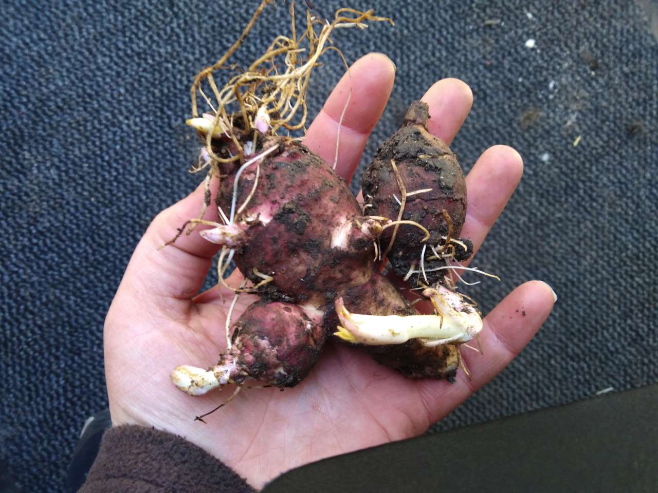 Die Topinambur-Knollen haben wir eingepflanzt, damit wir ständig Blätter und Knollen für unsere Meerschweinchen und Kaninchen ernten können.