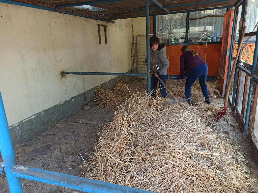 Die beiden packten richtig zu: Das Kaninchengehege wurde komplett ausgeräumt. Die alte Einstreu musste herausgekratzt und zum Kompost gebracht werden. Das sind mehrere Stunden harte Arbeit.