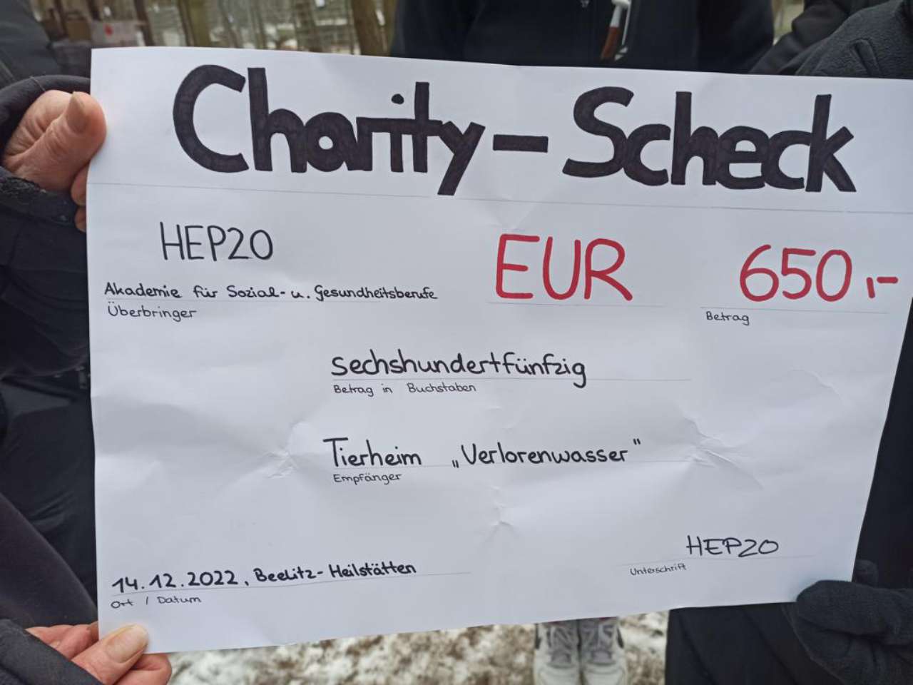 Diesen liebevoll gebastelten Scheck - und das zugehörige Bargeld - übergaben uns Studenten der Ausbildungsklasse Heilerziehungspfleger aus Beelitz.