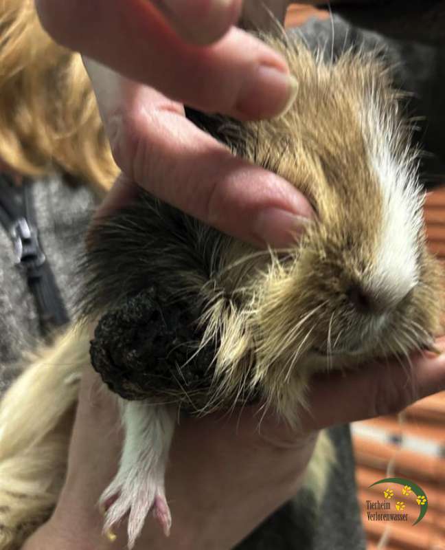 Unter der großen Wucherung bzw. der Verkrustung am Hals des einen Meerschweinchens vermuten wir eine offene Wunde, denn es stinkt bestialisch.