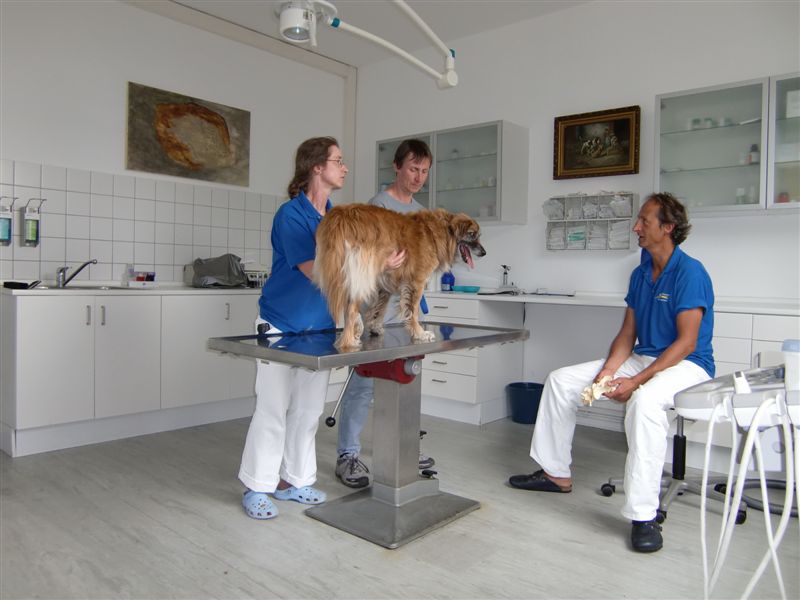 Duke nahmen wir also auch zu Dr. Köhle mit. Der fand jedoch genauso wenig einen Hodenbruch oder andere Knochenverletzungen wie unsere Tierärztin. Da wir um unseren guten Ruf besorgt waren, bestanden wir auf einer Röntgenuntersuchung. Die wollte Dr. Köhle in Narkose machen. Also musste auch Duke erneut anreisen. Doch auch das Röntgen in verschiedenen Ebenen ergab nichts. Lediglich eine Fettbeule am Schwanz war der einzige "Fehler". Die wurde dann auch entfernt - und wenn schon Narkose, dann ließen wir wenigstens die Zähne noch gleich mitmachen.