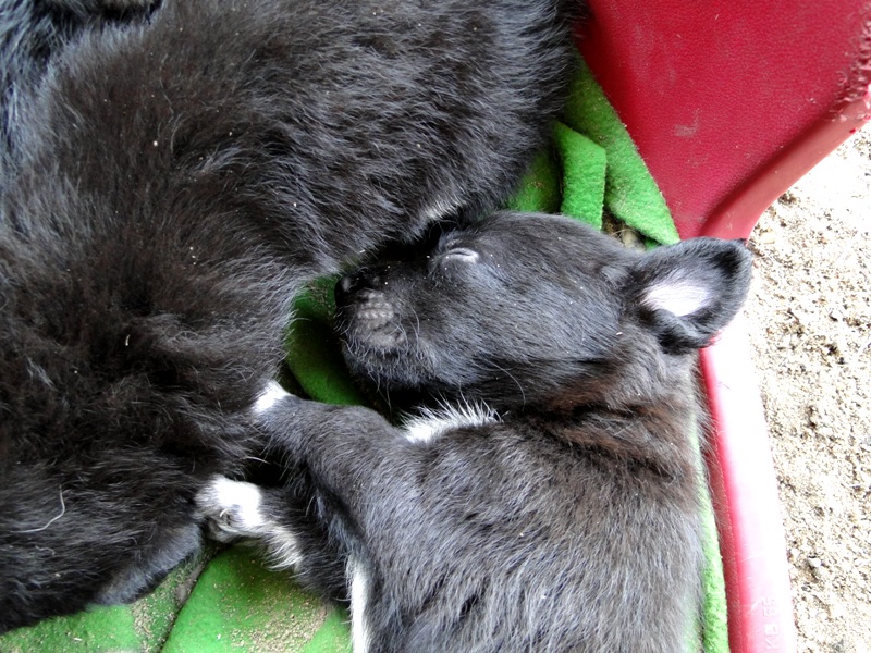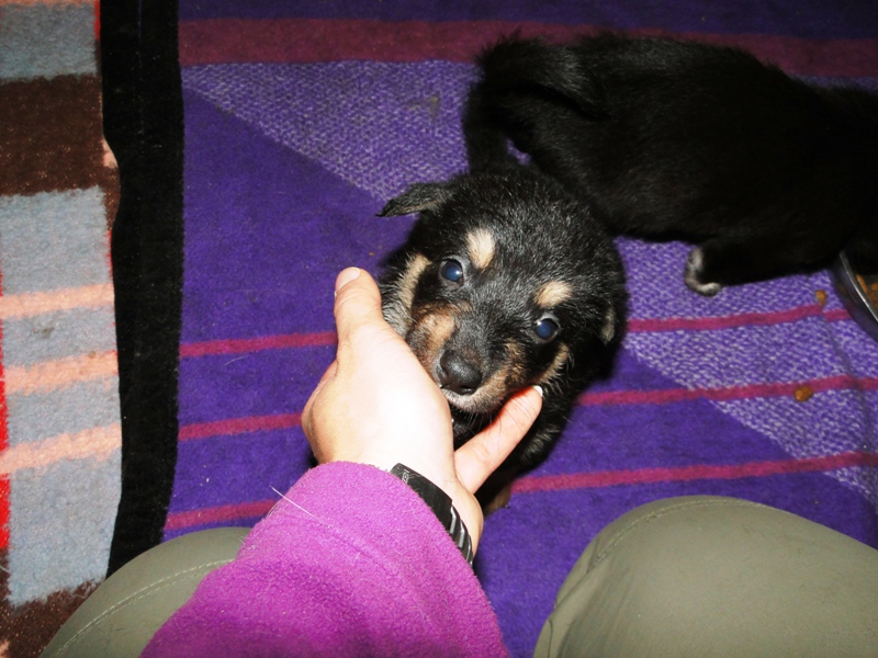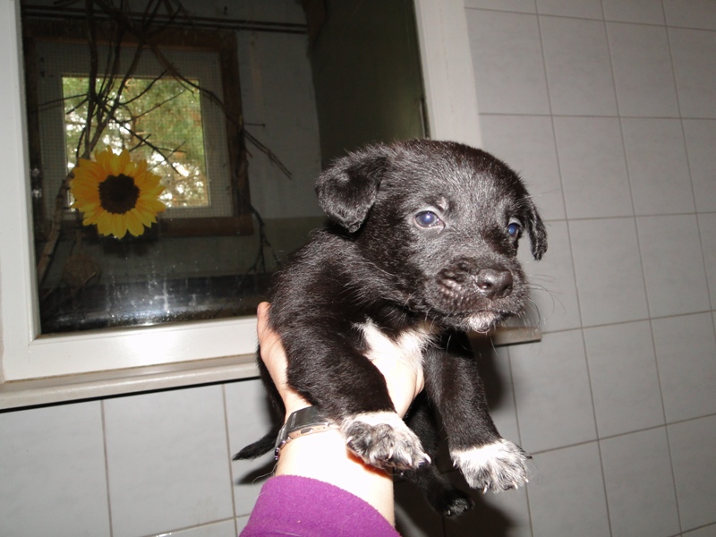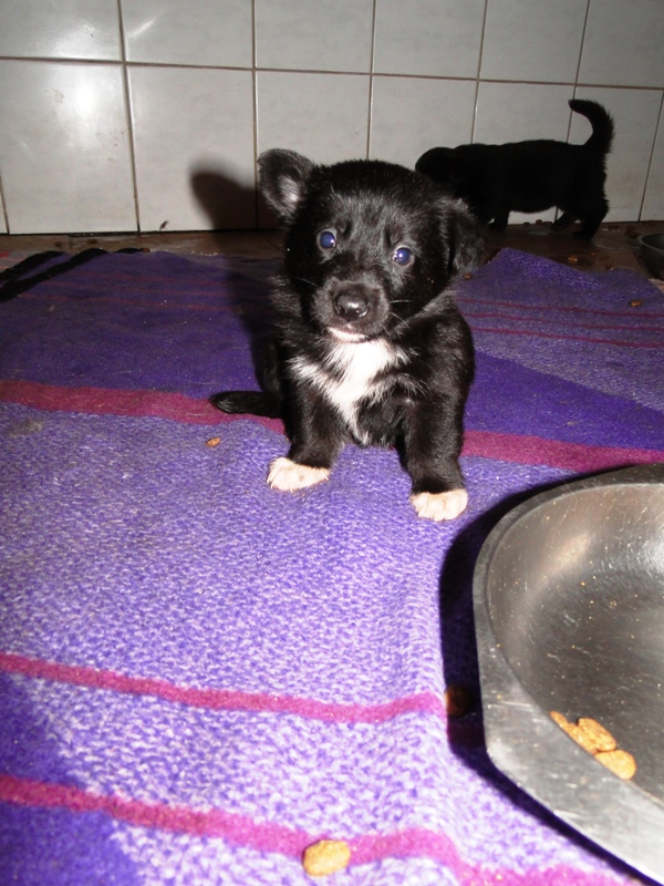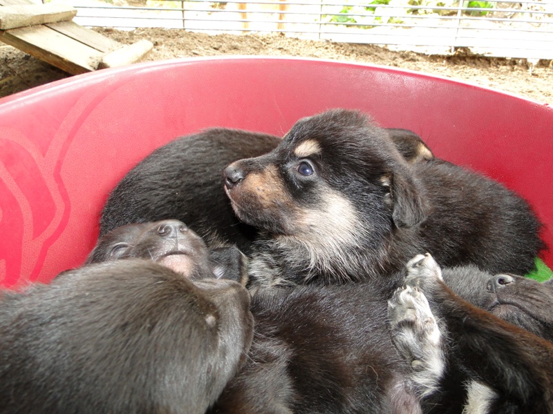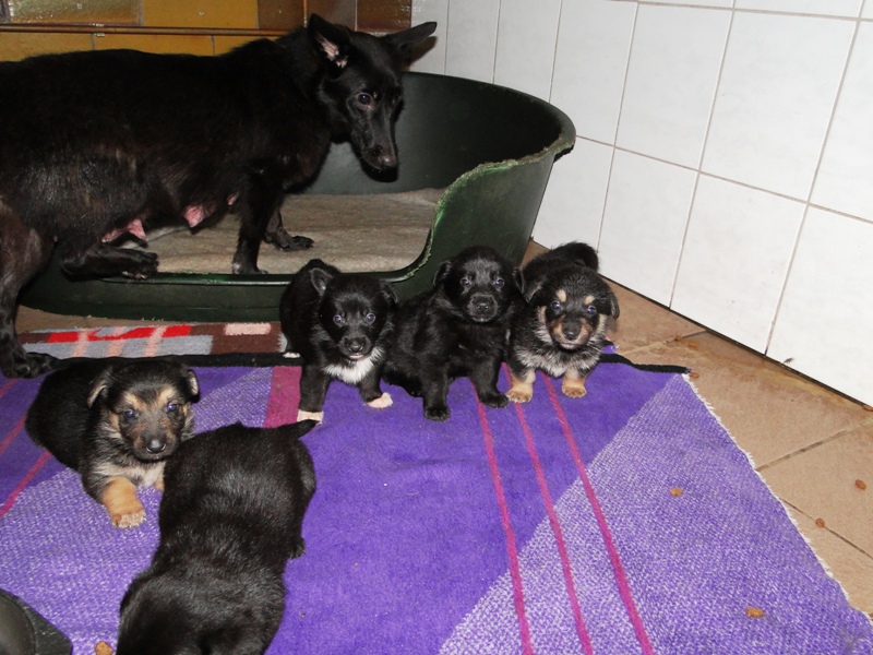 Da wir extrem voll sind, gab es keinen geeigneten Zwinger für die Kleinen. So bringen wir sie tagsüber in einem stillgelegten Kaninchenauslauf unter, damit sie auch genügend toben können.