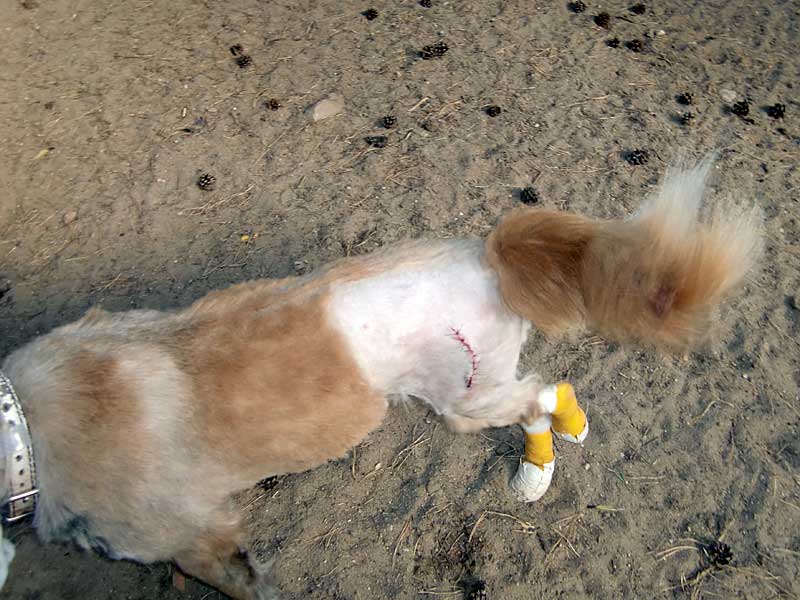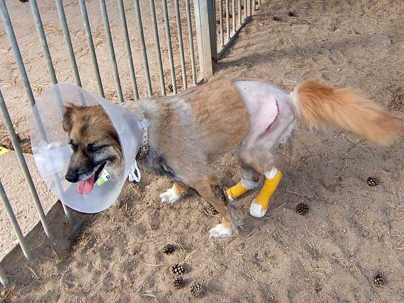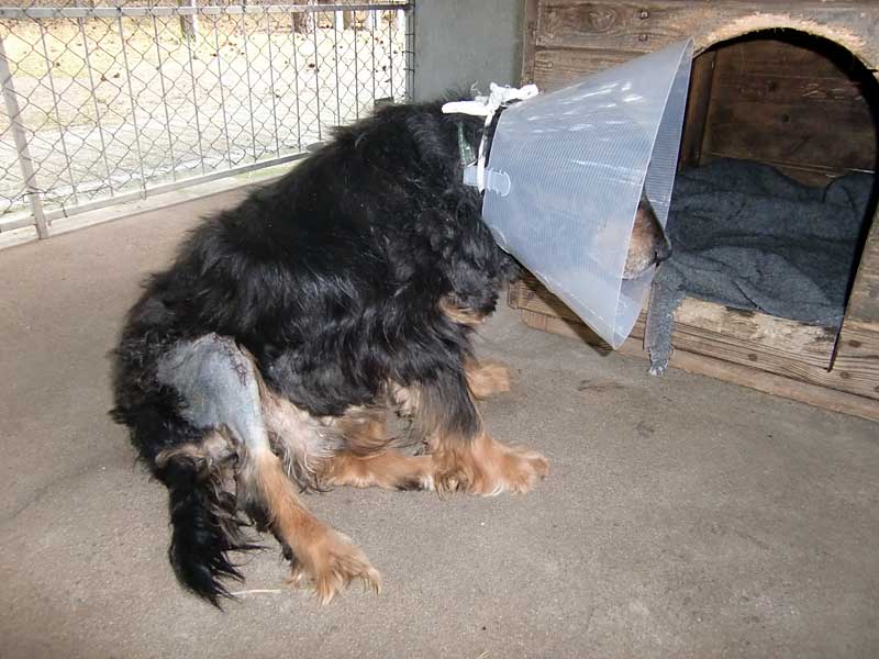 Butch musste sein Gelenk operieren lassen und Cockys Kreuzbandriss wurde geheilt. Gefallen hat das den beiden nicht - besonders die "Tüte" hinterher ist doch sehr belastend für jedes Tier. Aber nur so wurde nun alles gut und die beiden sind wieder schmerzfrei.