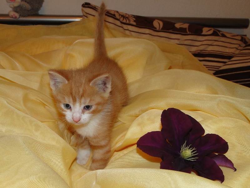 Soviel Neues zu berichten gibt es eigentlich nicht. Sie sind absolut munter und haben es gestern auch endlich geschafft, den zimmerhohen Kratzbaum vollkommen in Beschlag zu nehmen. Sie üben Weitsprung, was natürlich nicht immer klappt, aber Übung macht den Meister. Was ihre Charaktere angeht - ja, das ist schwierig. Anfangs war ja der rote Kater ein Haudegen vom Feinsten. Die Fotos bei Mama im Arm können täuschen, meistens hat sie ihn gemaßregelt, ehe es zu den Fotos kam. Scheinbar hat ihn das ein bißchen gebremst, denn seine Brüder haben ihm den Rang als Raufbold abgelaufen. Der kleine Schwarze, der so lieb immer bei mir saß, weiß gar nicht so recht, wen er sich manchmal als erstes schnappen soll. Aber auch die Mädchen lassen sich nicht lumpen und steigen gerne mit ein, wenn es heißt "Alle auf einen".