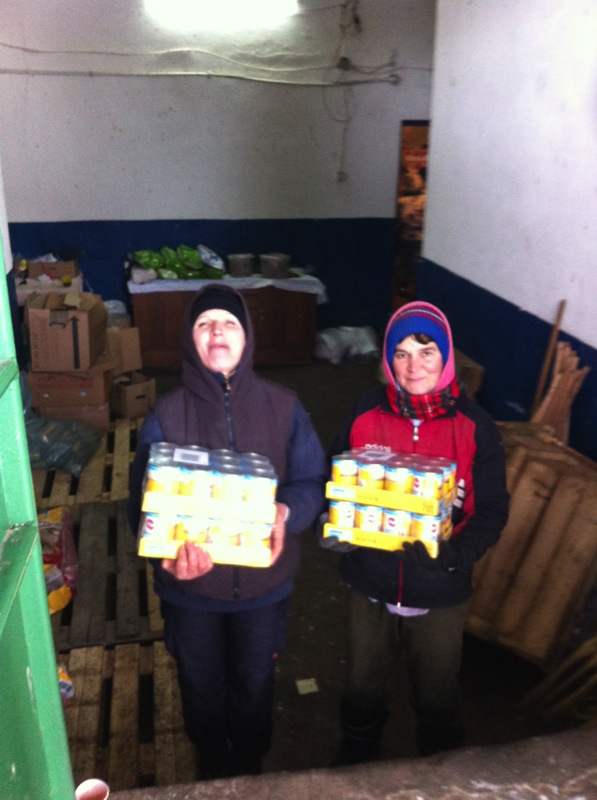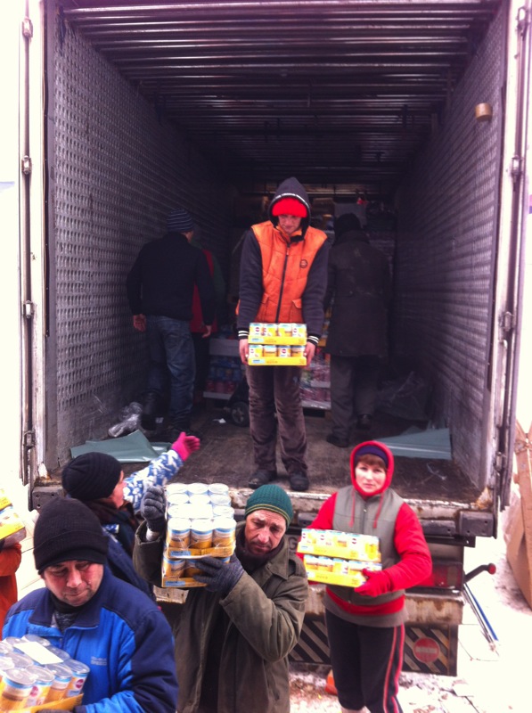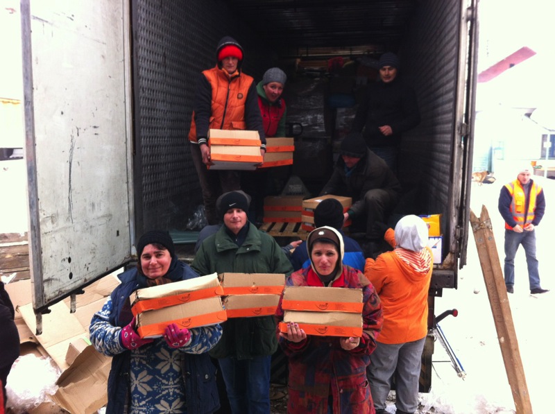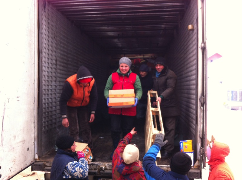 Die Mitarbeiter mussten leider alles von Hand abladen, denn aufgrund des Schnees konnte der Gapelstapler nicht fahren. Er sprang bei den Minustemperaturen auch gar nicht erst an.