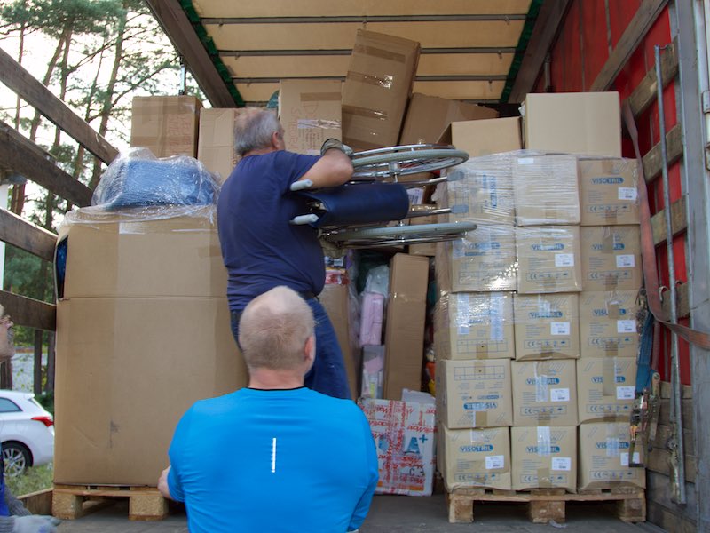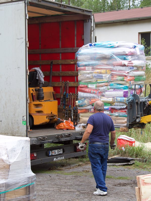 Uns ist es ein Rätsel, wie unsere rumänischen Kollegen den LKW entladen wollen - ohne Geräte. Aber irgendwie werden sie es bestimmt schaffen. Und sich dann hoffentlich an den vielen Spenden freuen.