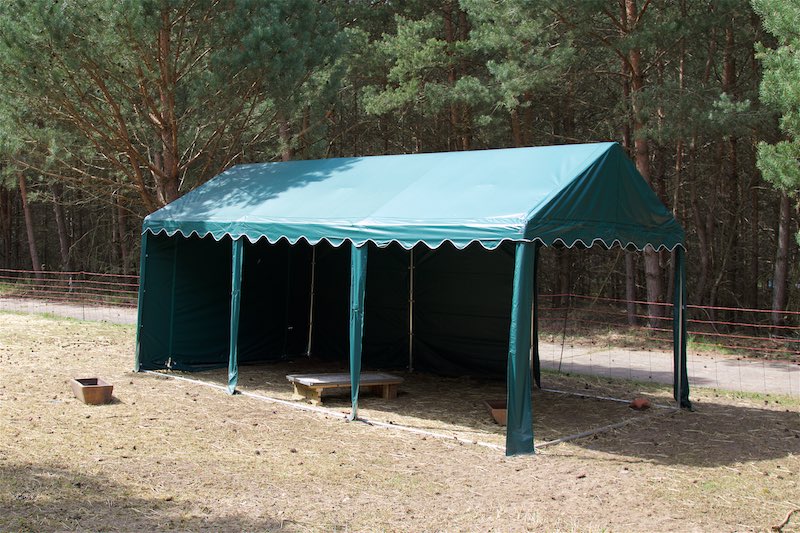 Als Unterstand hatten wir ein transportables Häuschen. Leider was es für die 10 Tiere zu klein. Unser Tierheimleiter trieb deshalb einen Carport auf. Er ist schön stabil, sehr groß und die einzelnen Seiten können je nach Bedarf und Witterung abgebaut oder angehängt werden.