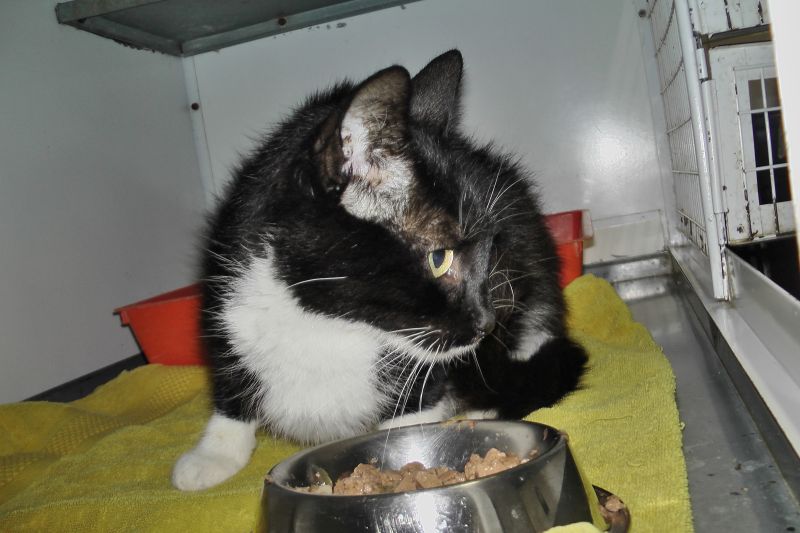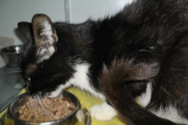 Tierfreunde brachten abends eine Katze in schlechtem Zustand zu uns. Sie gierte entsetzlich nach Futter.