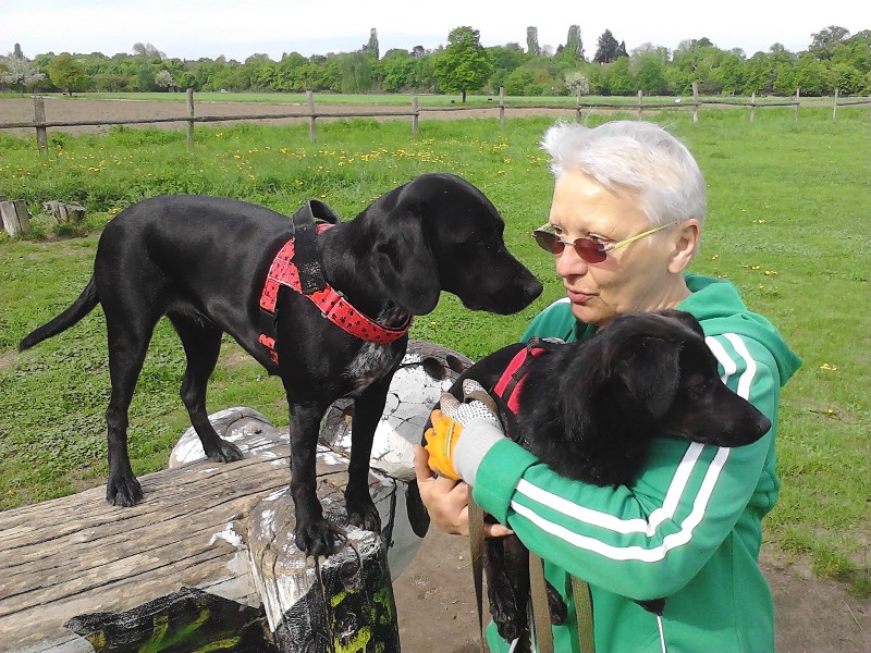 01"Hallo liebe Tierheimmenschen, vorgestern ist Mimi zu uns gekommen und ich wollt kurz mitteilen, dass es ihr sehr gut geht. Heute morgen waren wir in der Domäne Dahlem spazieren und Mimi war zu allen Schandtaten bereit. Die 10 m Laufleine verhinderte gerade noch ihren direkten Besuch bei den Kühen, Schweinen und Schafen. Sie frisst und schläft gut, wie es sich gehört verrichtet sie ihr Geschäft draußen. Cleo schläft im Mimis und Mimi in Cleos Bett. So muss es wohl sein.