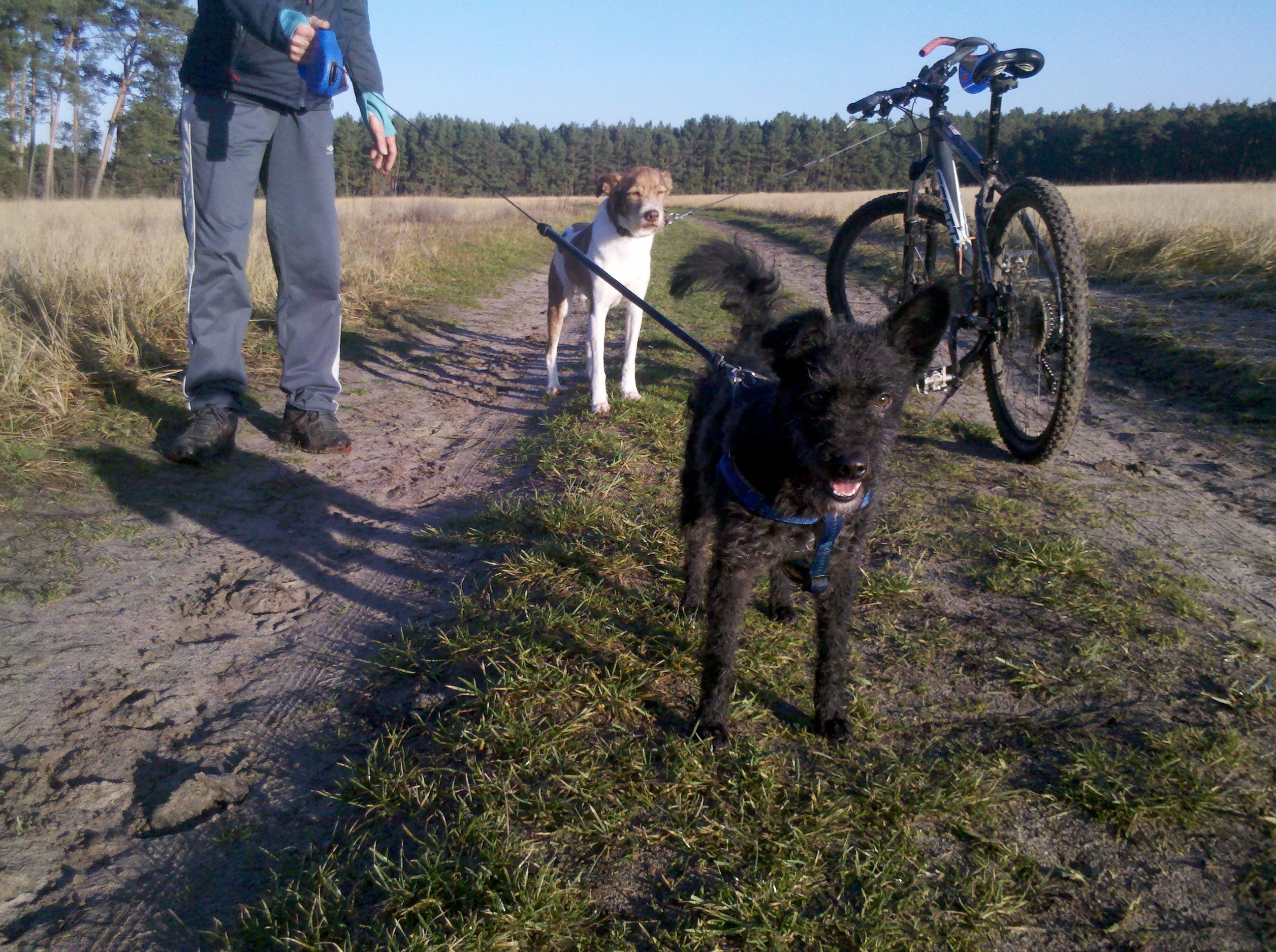Patty, wir haben sie in Peppi umbenannt, hat sich gut eingelebt. Sie hört schon richtig gut auf ihren Namen und auf den Befehl "hier". Sie liebt es, sich zu bewegen und joggt mit Frauchen super gern. Dabei gibt sie das Tempo vor und wir haben die knapp 10 km locker in 50 Minuten geschafft (vorher mit unserem Trau schon mal der Schnupperpausen wegen in 70 bis 80 Minuten). Entsprechend ist unser Trau auch eher weniger begeistert. Sie laufen gemeinsam an einer Koppel und Peppi trainiert dabei auch noch ihre Brustmuskulatur, indem sie Trau mit dem Geschirr zieht. Wenn wir dagegen spazieren gehen, wird jedes Mauseloch gesucht und auch gefunden und dann nach Kräften nach Mäusen bebuddelt. Außerdem findet sie es toll, mit Herrchen zu radeln.