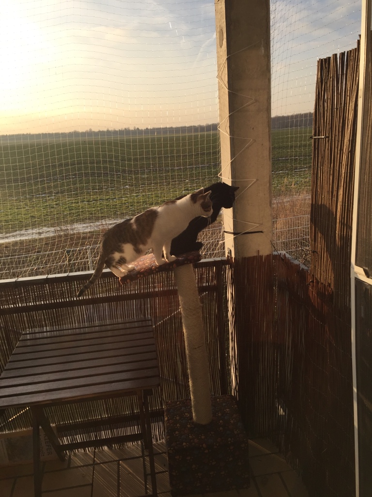 Mit meiner Kumpeline mache ich die Bude unsicher, turne über die Kratzbäume oder sonne mich auf den Balkonen.