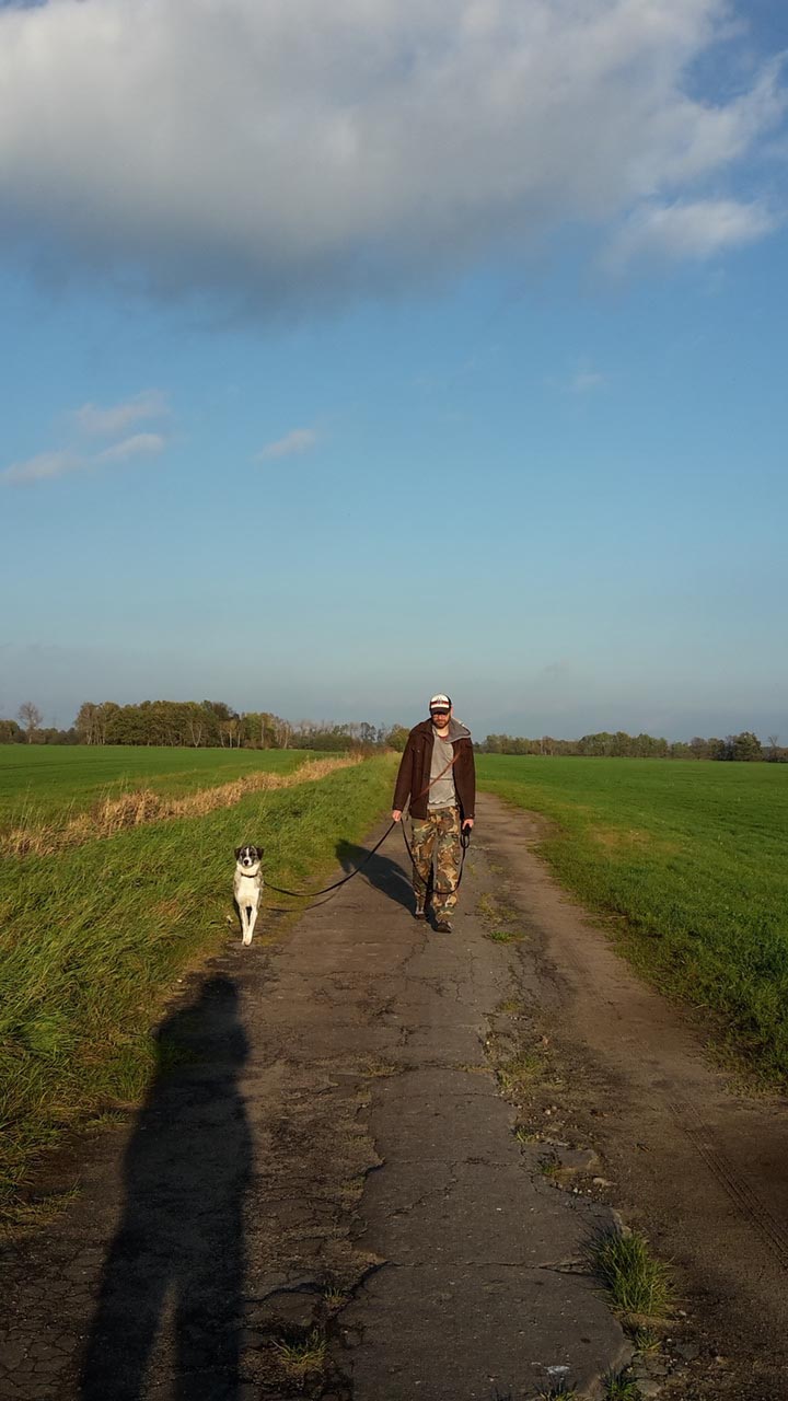Wir gehen zwei mal am Tag Gassi, die Runde vor dem Schlafengehen liebt er am meisten, da kommt er inzwischen schon von selbst aus seiner Ecke bis in den Flur, wenn er die Leine hört. Auf dem Hof, darf er inzwischen sogar ohne Leine laufen, denn sein Fluchtinstinkt geht ins Haus, ich lasse immer eine Tür offen, so kann er sich zumindest erstmal in die Veranda flüchten, wenn wiedermal ein Traktor über die Strasse holpert.