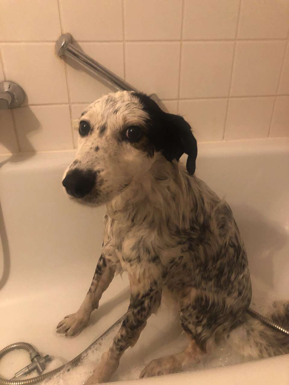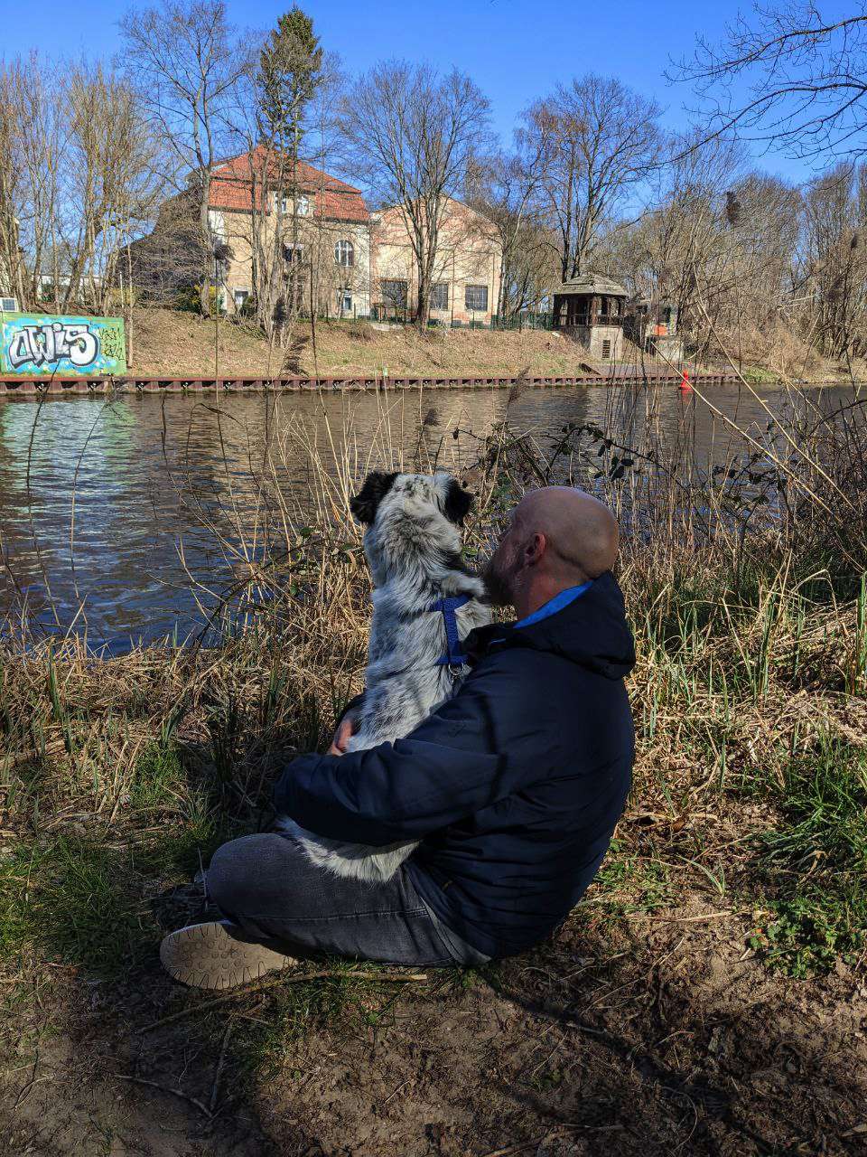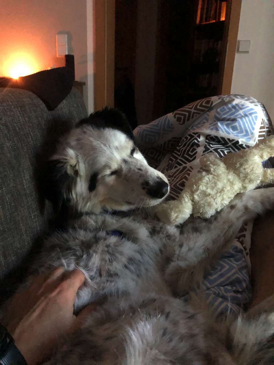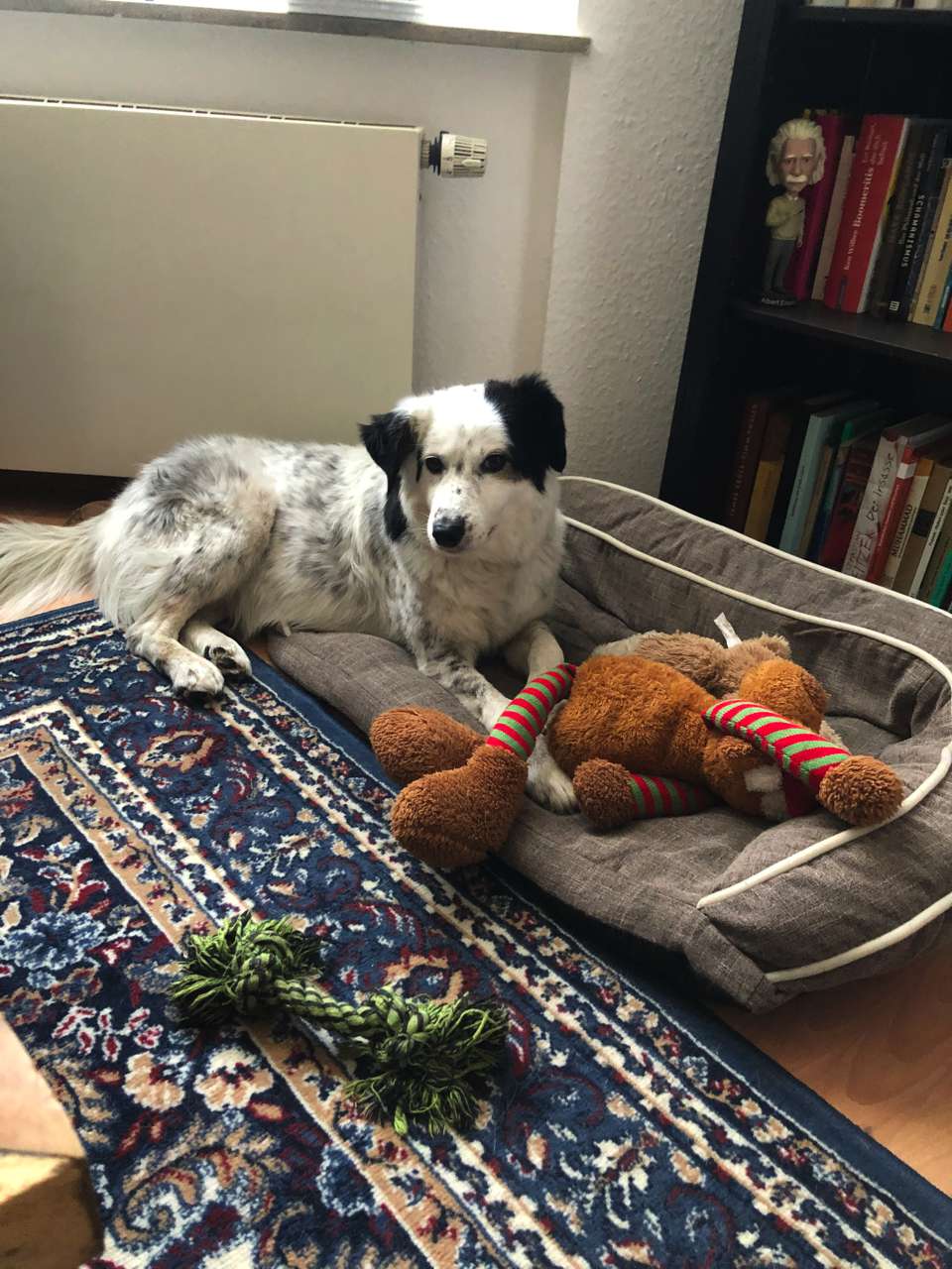 Henry ist ein toller Hund. Zu Beginn war er wirklich mega ängstlich, hat sich draußen immer im Kreis gedreht und wollte vor allen erdenklichen Geräuschen, Menschen und Tieren fliehen. Seine heimische Gassi-Runde vertraute er relativ schnell und wurde etwas ruhiger. Zuhause musste er sich eingewöhnen, ich mich auch. Er wollte öfter seine Ruhe und zeigte auch ein Lächeln, also seine Zähne und probierte einen Schnapper. Das habe ich immer erfolgreich ignoriert und die Frequenz nahm zunehmend ab. Seit ein paar Wochen scheint er endgültig angekommen zu sein und Vertrauen zu haben. Innerhalb der Wohnung sucht er oft Zuneigung, geht aber auch, wenn er Ruhe haben möchte, in seinen Korb. Schlafen tut er, gefühlt, jede Nacht woanders. Bisher ist er nur selten ins Bett gekommen. Er ist super gelehrig, allerdings nur bei Dingen, die für ihn vorteilhaft sind, oder wo er gefallen möchte. Er kennt den Wecker sehr gut, springt dann ins Bett und will kuscheln und spielen. Da geht mir morgens das Herz auf. Draußen führt er sich, in gewohnter Umgebung, problemlos an der Leine und setzt sich an der Straße. Dann hört es aber bisher schon auf. In Sachen Training habe ich noch nichts gefunden, was ihn motivieren könnte. Leckerlies, in welcher Form auch immer, findet er doof. Spielzeug, ab und zu mal einen Ball jagen. Kuscheltiere findet er in der Wohnung ganz cool. Oder meinen Kleiderschrank aufmachen und die Socken durch die Gegend werfen. Einmal hat er auch den Kleiderschrank aufgemacht und dort geschlafen. Er überrascht mich immer wieder mit seinen Ideen.