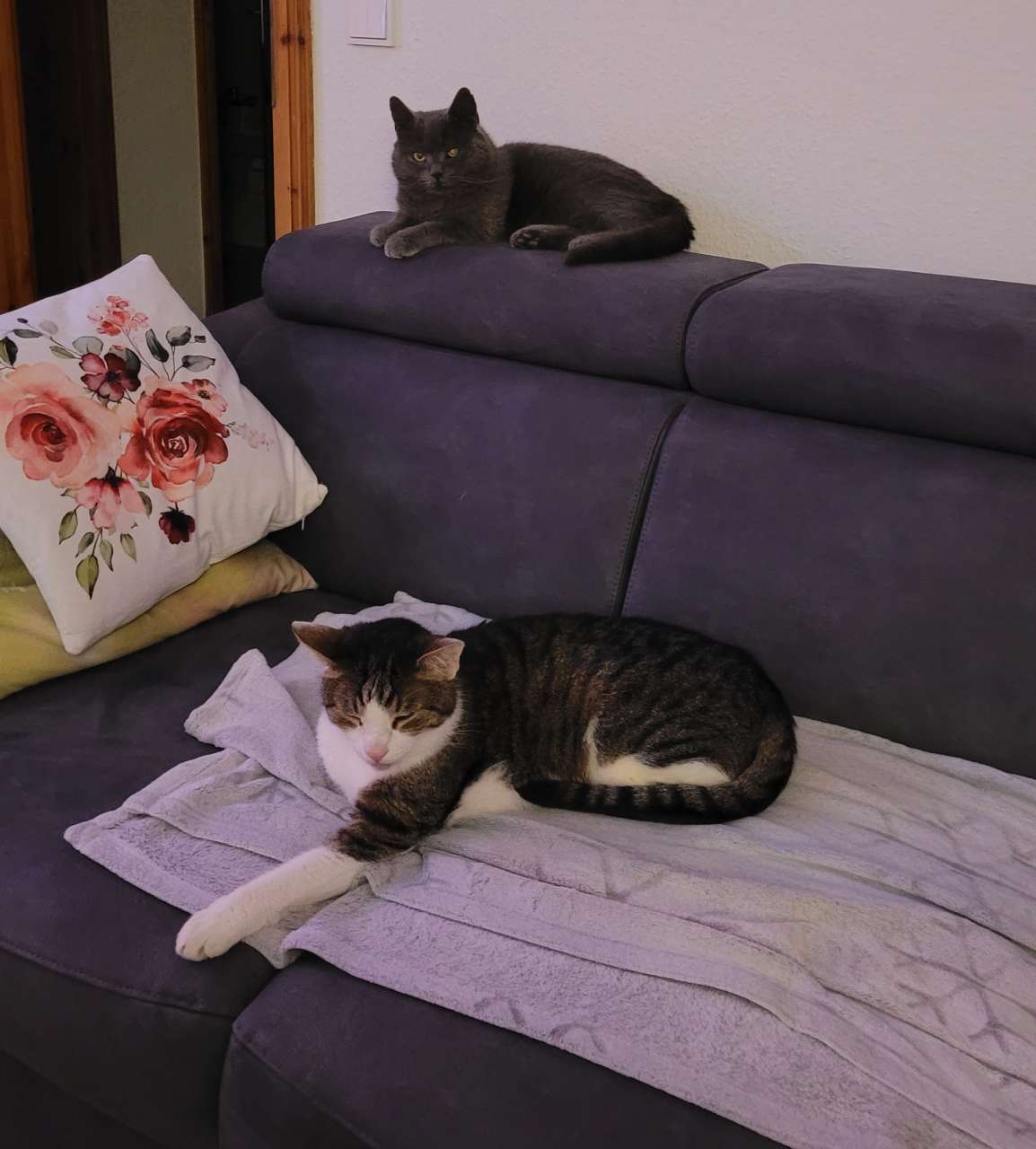 Aber jetzt fressen sie nebeneinander, Moritz versucht ihn zum Spiel zu animieren, er lässt sich gern streicheln und schnurrt auch. Selbst auf den Schoß können wir Moritz nehmen und er kuschelt dann. Faszinierend findet er aber nach wie vor den Fernseher 📺.