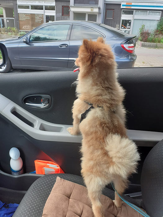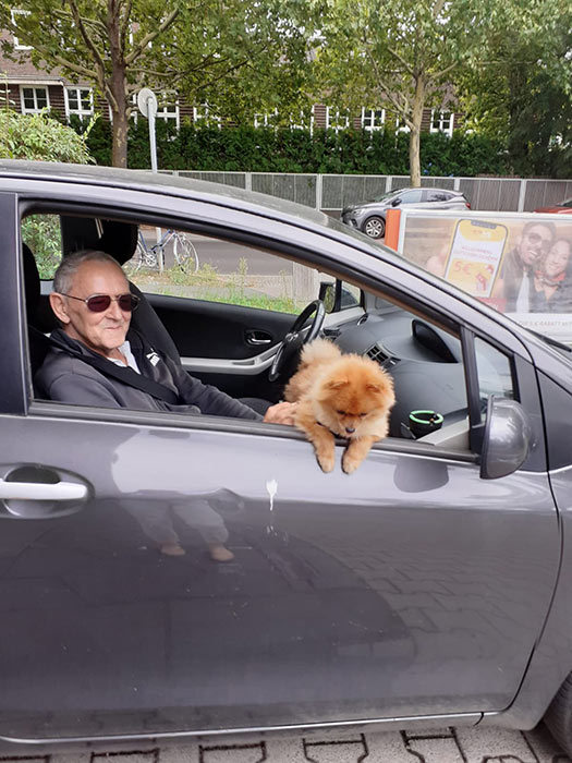 Theos neue Familie sandte uns Fotos und berichtete von seinem neuen Lieblingshobby: Auto fahren.