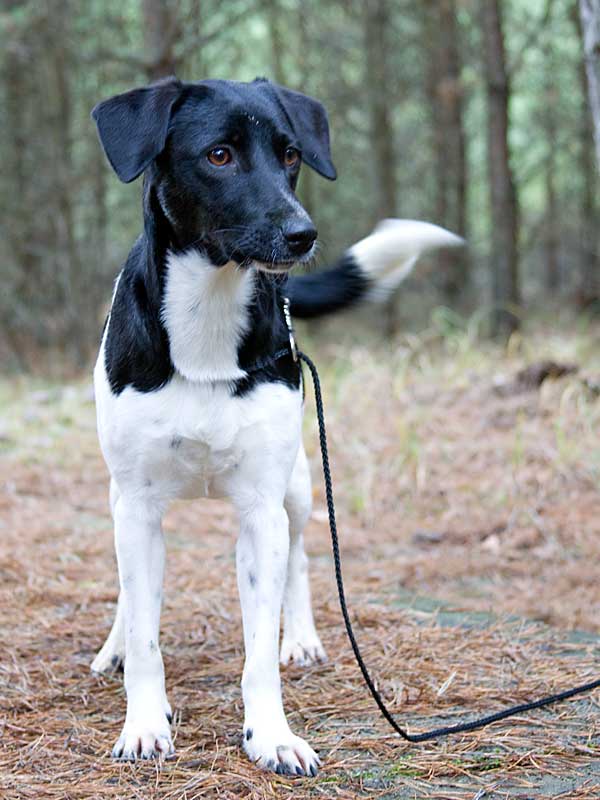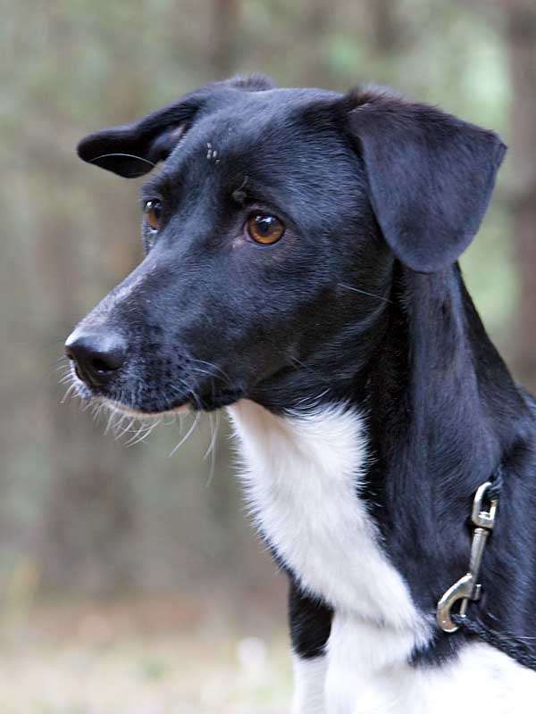 Donna - eine zweijährige Münsterländermischlingshündin - ist ein echter Wirbelwind und möchte den ganzen Tag spielen. Ihre Menschen begrüßt sie mit größter Freude, das Schwanzwedeln hört dann nicht auf.