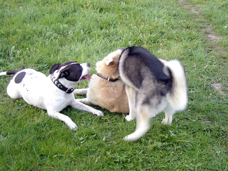Aber am liebsten spielt er mit den neuen Kumpels aus unserer Hundegruppe. Regelmäßig geht es ins Hundeauslaufgebiet und dann gibt's kein Halten mehr. Wasser scheint sein Element zu sein.