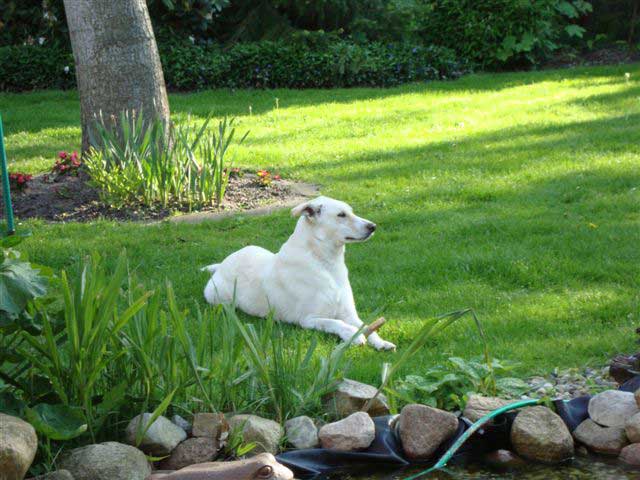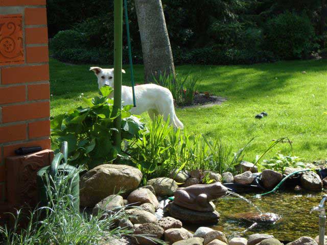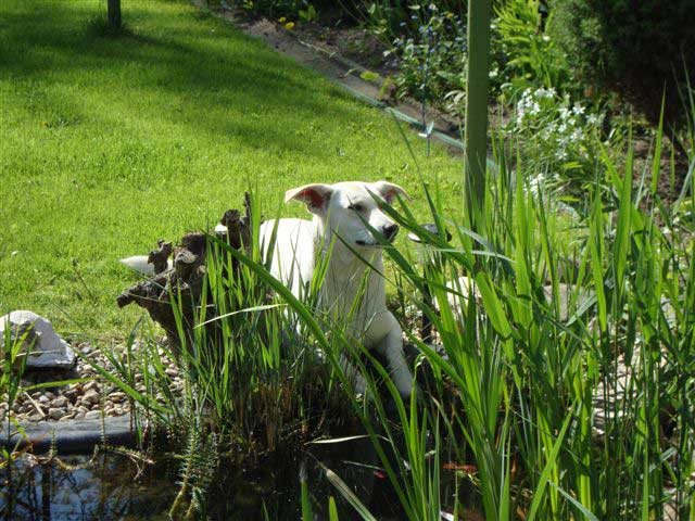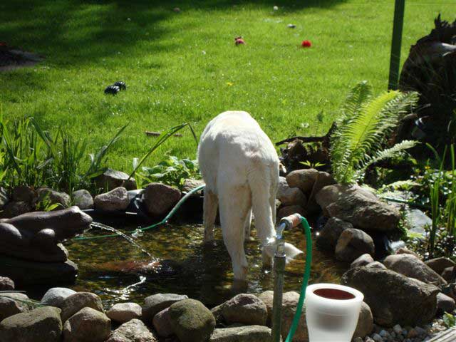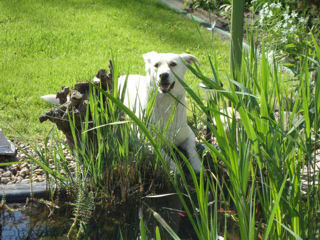 Ich denke, die Bilder sprechen für sich. Unserem Vierbeiner geht es ausgezeichnet und sie freut sich jetzt schon sehr auf die kalte Jahreszeit, mit der sie überhaupt keine Probleme hat. Im Gegenteil - Donna liebt Frost und Schnee. Allerdings mag sie auch unseren Gartenteich sehr wie man sieht.