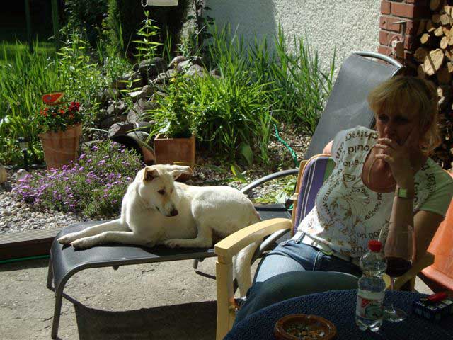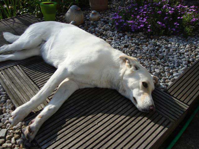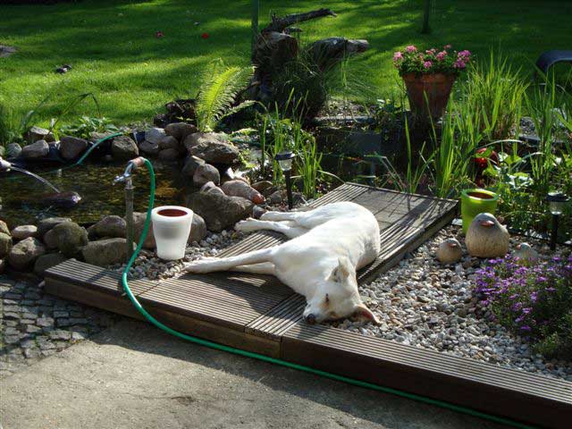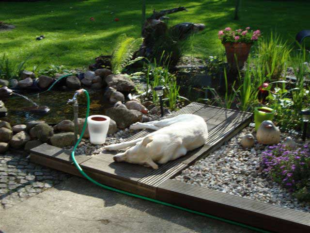 Für gewöhnlich legt sie sich komplett zur Abkühlung in den kleinen Teich hinein und danach auf den Steg und dort bleibt sie manchmal stundenlang zum Träumen liegen. Es sei denn... ich steuere mit einem Buch in der Hand zu meiner Sonnenliege. Dann ist Donna mit ihren vier Beinen klar im Vorteil. Sie ist sehr viel schneller dort und auch drauf. Also drängeln wir uns dann beide auf der Liege ein wenig zusammen. Aber was ein gut erzogenes Frauchen ist, das läßt natürlich unserer vierbeinigen Prinzessin den Vortritt und setzt sich brav auf einen Stuhl. Donna hat die Liege vom ersten Moment an für sich als besten Platz mit Überblick auserwählt und dabei ist es halt geblieben.