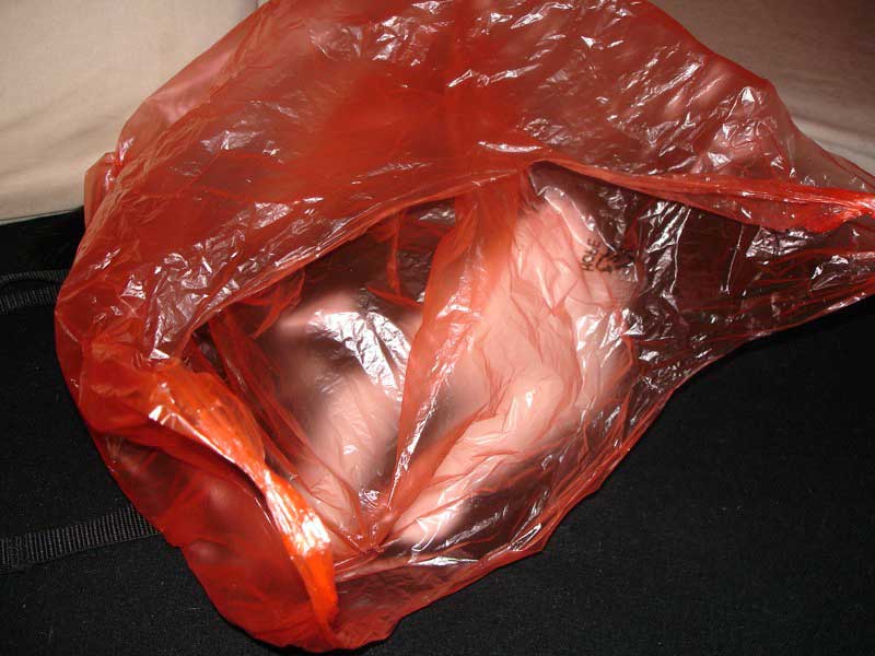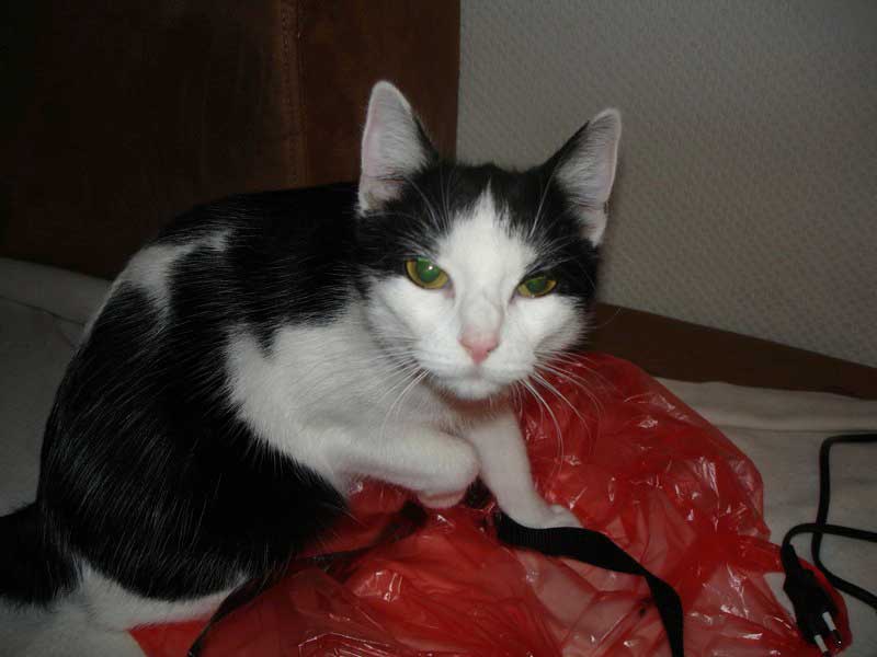 Bis auf diesen Zwischenfall heute morgen, hab ich hier nen riesen Spaß. Ich spiele super gerne mit roten Plastiktüten (darf ich nur unter Aufsicht!!) und ich kann schon mal etwas sauer dreinschaun wenn man mir die Tüte wegnehmen will ... (siehe Foto)