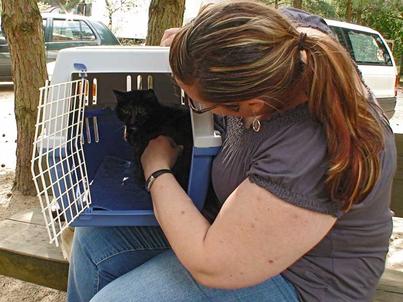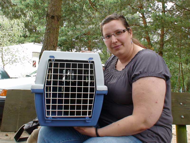 Auch die nette junge Frau, die sich nun ernsthaft der Katze annahm, bekam erst einmal tüchtig eins mit der Pfote übergeholfen. Doch anders als bisherige Besucher ließ sie sich nicht davon abschrecken und adoptierte Luzifa. Die Mieze mochte die ungewohnten Vorgänge so gar nicht, kroch unwillig in die Transportbox und kehrte uns nur noch ihr Hinterteil zu.