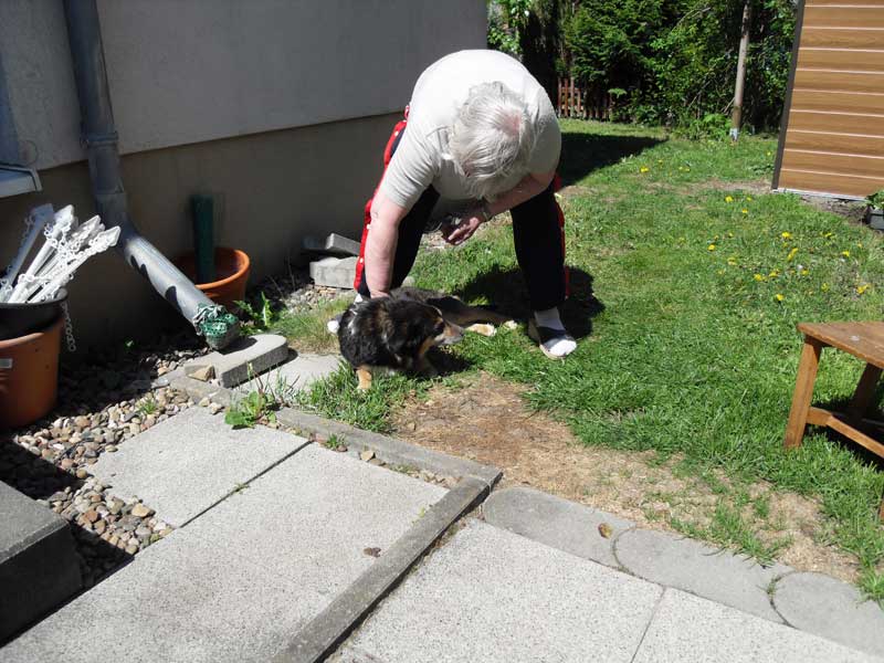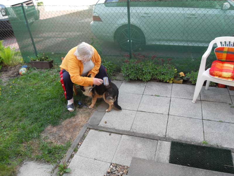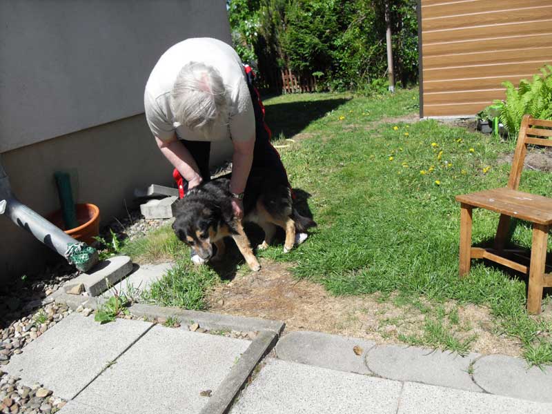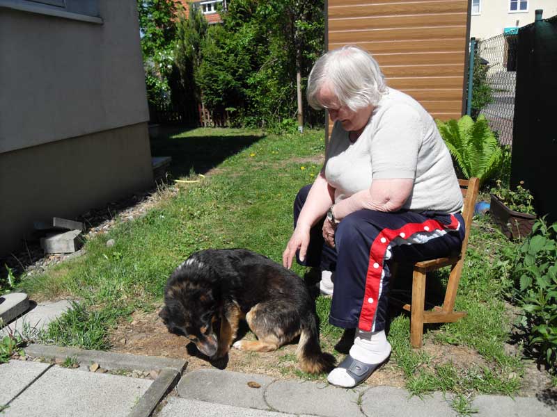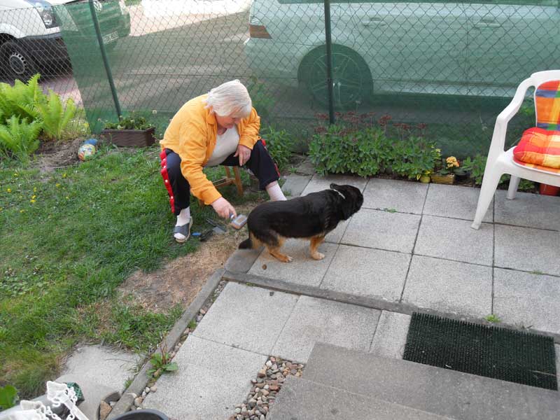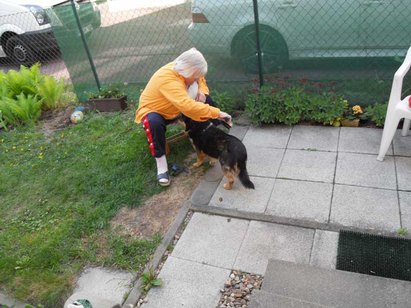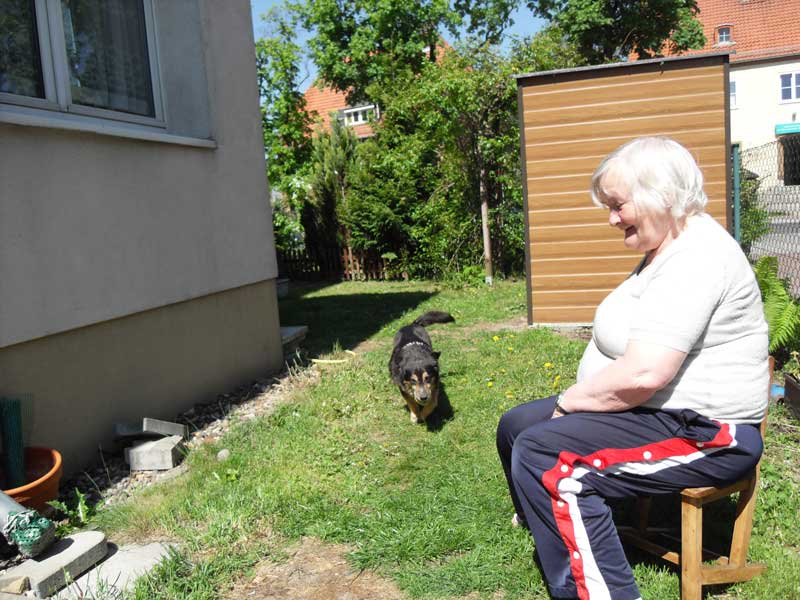 Heute komme ich dazu, Euch zu schreiben. Wie Ihr wißt, bin ich seit dem 07.05.2011 bei meinen Adoptiveltern in Stahnsdorf. Dieses neue Zuhause gefällt mir sehr gut. Ich habe einen großen Zwinger, meine Eltern nennen es Garten. Der gehört nur mir und meinen Eltern. Da kann ich alleine spazieren gehen und mit meiner Mutti Fußball spielen. Wenn Mutti nicht will, habe ich eine große Klappe und schnauze sie an. Vati lacht dann immer und das freut mich. Mit Mutti Fußball spielen macht viel Spaß.