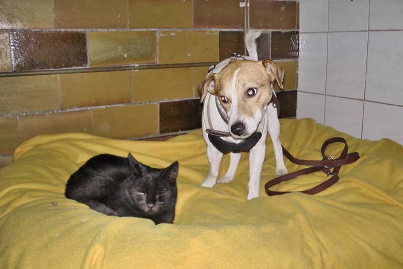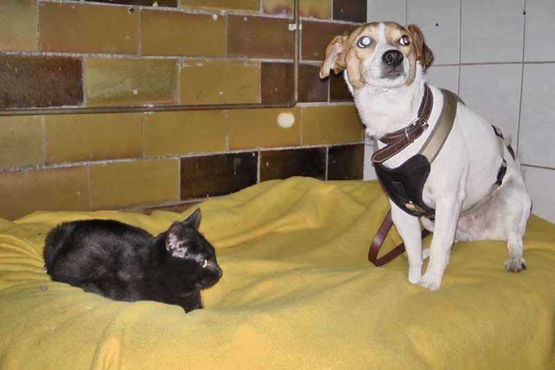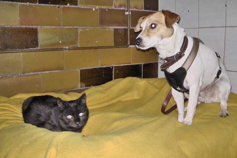 BassoNicht nur Bassos neues Frauchen war aus Nuthetal angereist, um nach einer neuen Katze Ausschau zu halten. In ihrer Begleitung befand sich auch einer der beiden selbstbewussten  Jack-Russell-Terrier, die schon bei ihr wohnen. Die neue Katze musste also auf ihre Fähigkeiten als "Killer-Cat" mit Hypnoseblick, Selbstverteidigungs-Pfotenschlag und innerer Ruhe getestet werden. Basso nahm den Besuch gelassen.