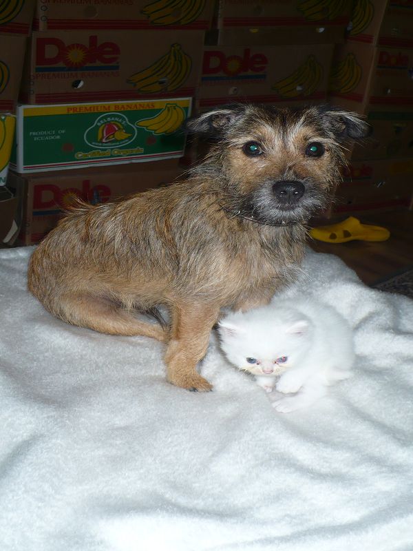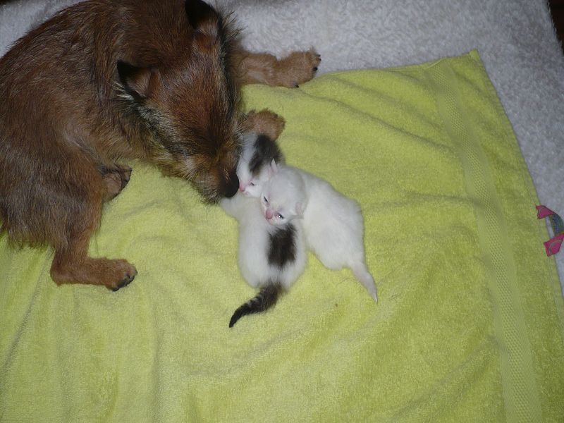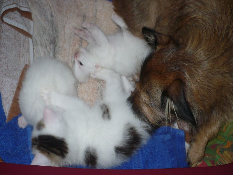 Ich sage Euch, das letzte Jahr war hier vielleicht aufregend und anstrengend. Das muss ich Euch erzählen. Wir haben hier doch 4 Katzenbabys von 2 Mamas bekommen. Das war ein Ding. Aber unsere eine Mami, die Miss Elly, konnte sich die ersten Tage nicht um ihre 2 Babys kümmern. Sie hat sehr hohes Fieber bekommen und konnte ihre Babys weder säugen noch pflegen. Und nun komme ich ins Spiel. Mein von mir heißgeliebtes Frauchen und unsere Tierärztin haben voller Stolz gesagt, wenn ich nicht gewesen wäre, wären diese Babys nicht mehr am Leben. Mein Frauchen und Alexandra haben beiden rund um die Uhr das Fläschchen gegeben, und ich habe den Putz und Pflegedienst übernommen. Ich durfte sogar mit in der Wurfkiste liegen, soviel Vertrauen hatte Miss Elly. Dies war alles furchtbar aufregend und anstrengend, aber diese ganze Mühe hat sich gelohnt. Aus 182 gr Katzenbaby ist nun eine 2,8 kg schwere Katze geworden, und das schmusen und gegenseitige putzen ist geblieben. Aber dann kam das aller schlimmste, und das hieß Abschied nehmen. Leute, das sind doch "meine" Babys und die sind nun bei neuen Familien. Das gute an der Sache ist aber, das diese Familien uns schreiben und mir Bilder schicken, damit ich immer weiß, wie es meinen Babys geht.