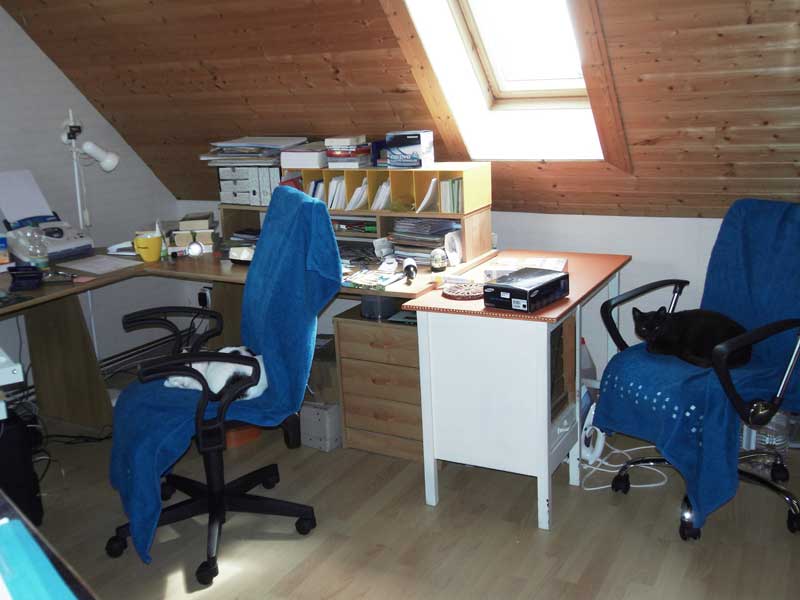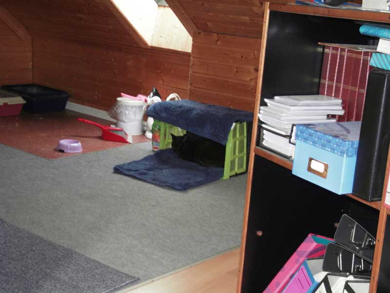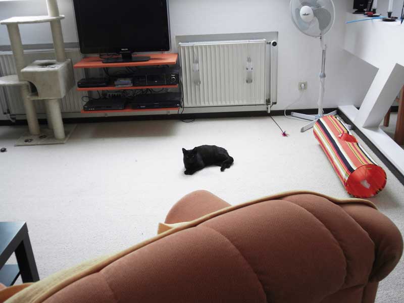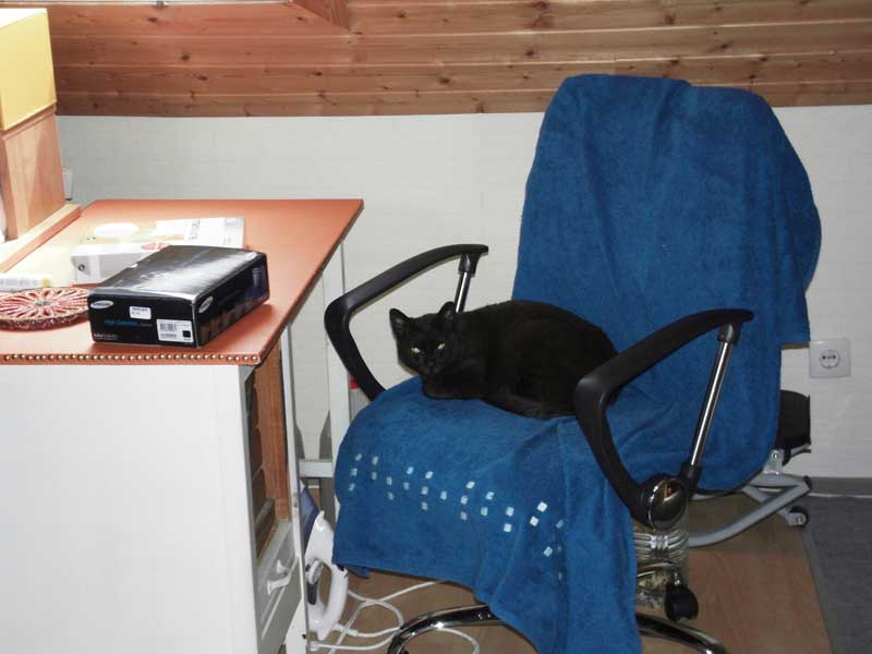Zu Hause angekommen wurde sie zwar interessiert und freudig von unserer ersten Katze Sammy begrüßt, aber Emma (so haben wir sie jetzt genannt, weil Okita ja nun wirklich kein Name für eine Katze ist ...) hat sich erst einmal volle acht Tage zurückgezogen und uns misstrauisch beäugt. Aber gefressen und gesch... hat sie gleich von Anfang an.