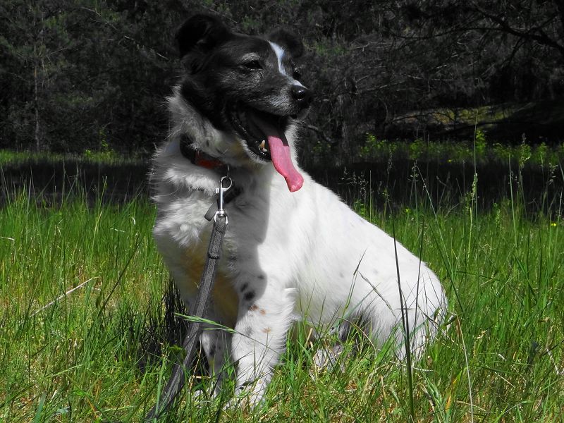 Er läuft super an der Leine, hält immer Blickkontakt zu seinem Menschen.