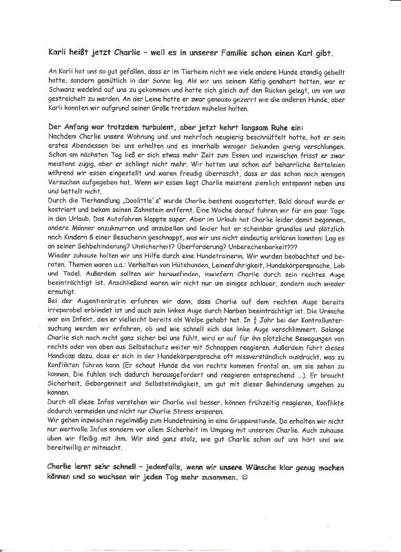 Charlie ist ein schönes Beispiel dafür, wie wunderbar es ist, wenn ein Tier nicht nur Futter von seiner neuen Familie erhält, sondern auch viel Liebe und großes Verständis für seine individuellen Probleme erfährt.